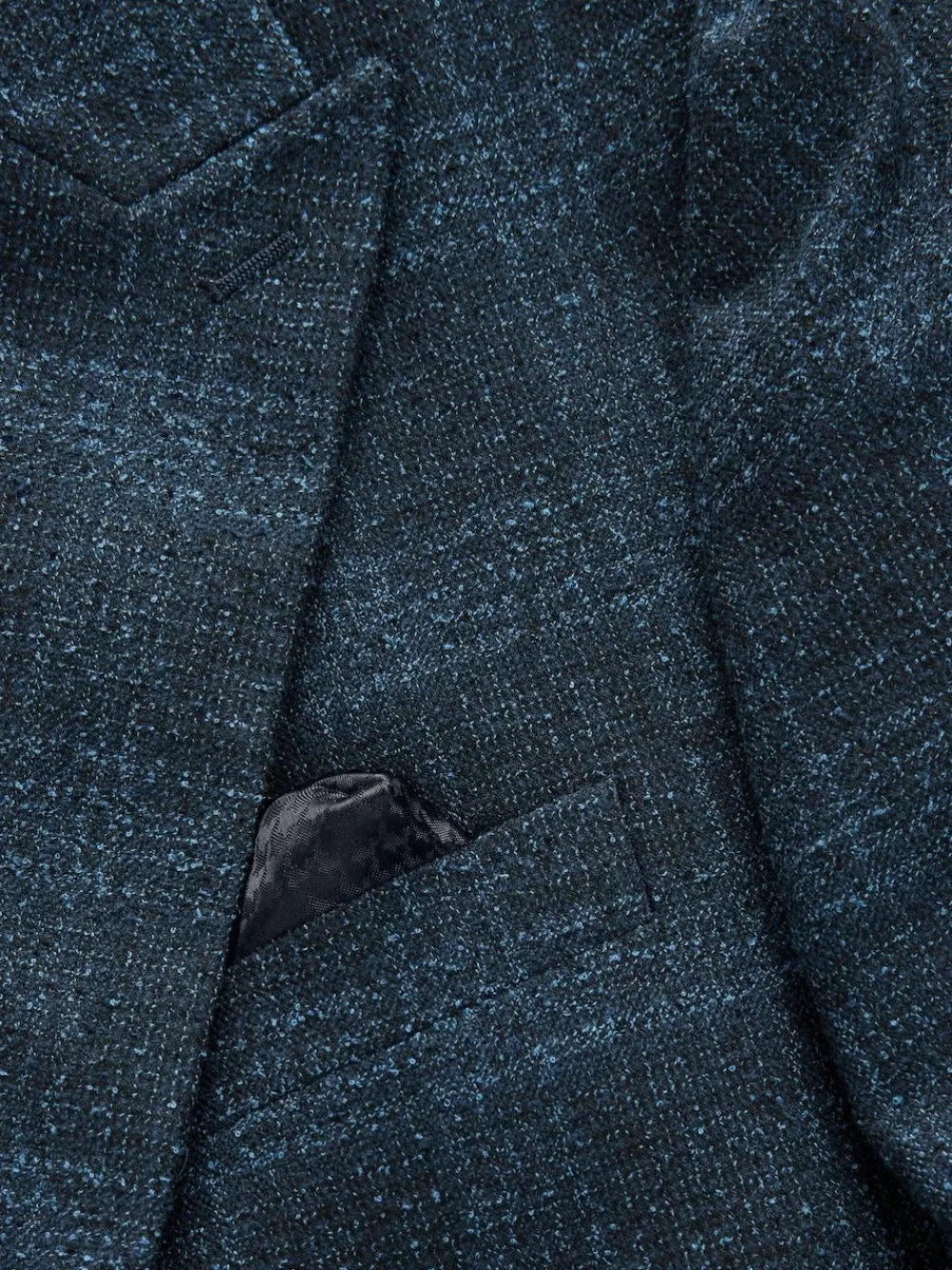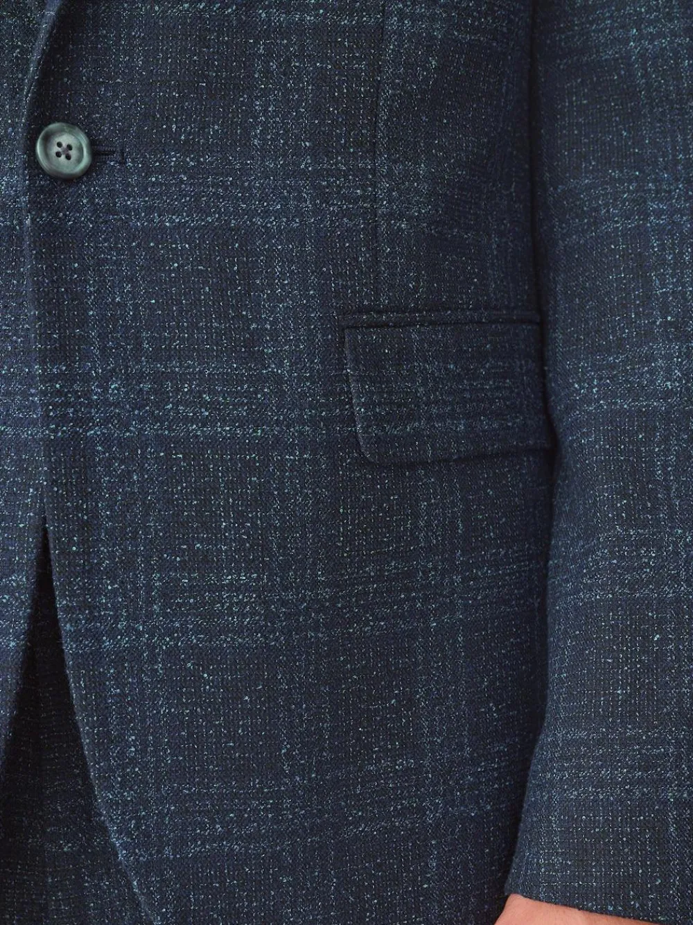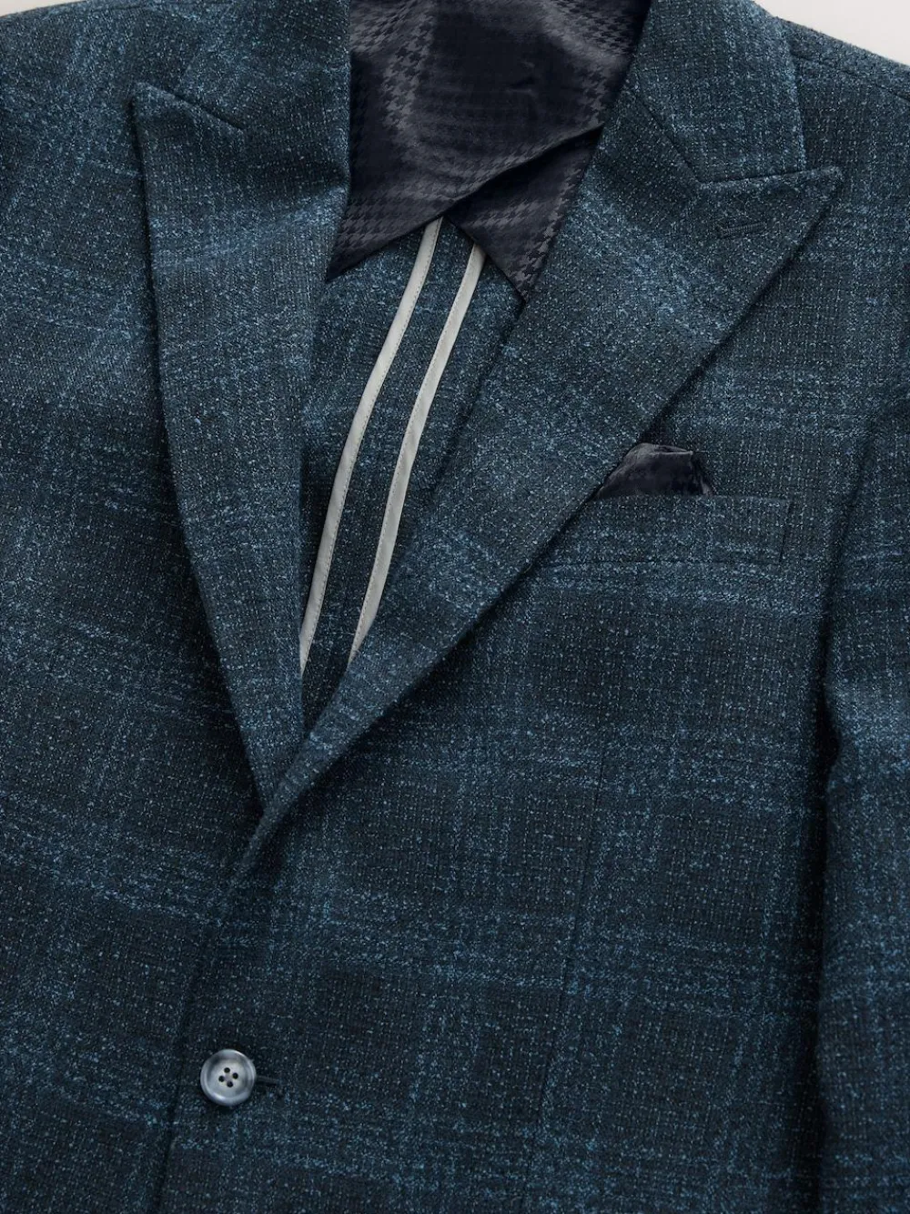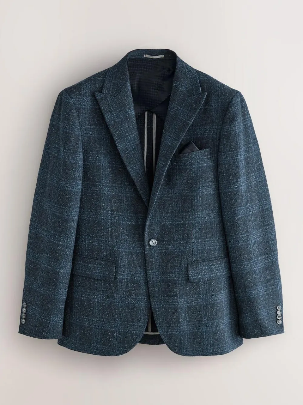 Refine your formal look with this slim-fit, navy-blue suit jacket. Its bold check pattern and sleek peak lapel create a sharp silhouette. A tonal jacquard lining and a pull-out pocket square add a luxurious finish, making this an excellent choice for a wedding or a smart event. Slim fit Check pattern Tonal jacquard lining Peak lapel Pull-out pocket square Two-button fastening Matching trousers available Check out The Suit Shop for more inspiration: https://www.next.co.uk/men/the-suit-shop Main 73% Recycled polyester, 26% Viscose, 1% Elastane. Lining 100% Recycled polyester.