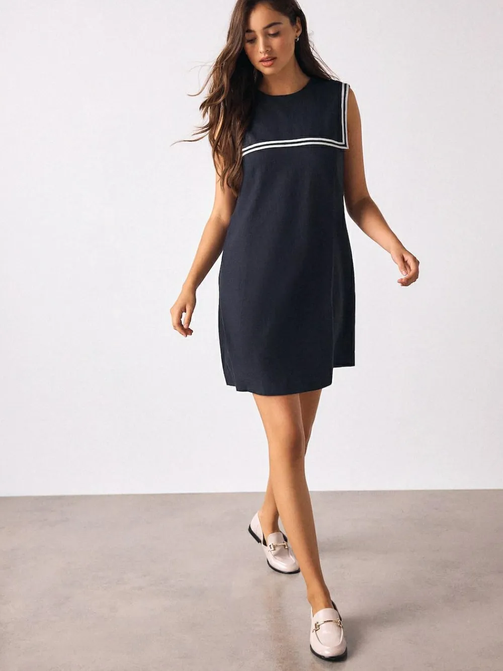 Embrace nautical charm with this navy sleeveless mini dress. Featuring a classic sailor collar with contrast tipping and made from a breathable linen blend, this easy straight-cut dress includes pockets. Perfect for comfortable casual summer wear. Linen blend Sailor collar with contrast tipping Sleeveless Pockets Back zip fastening Mini length Regular side neck to hem 34.5″ / 87cm. Machine washable. 55% Linen, 45% Livaeco™ Viscose. Items with the curve logo are available in sizes 18 and above., Our tall collection is designed to fit women 5’10” and above. This has been proportionally increased through the body, leg and sleeve to achieve the perfect fit. Available in sizes 8-20.