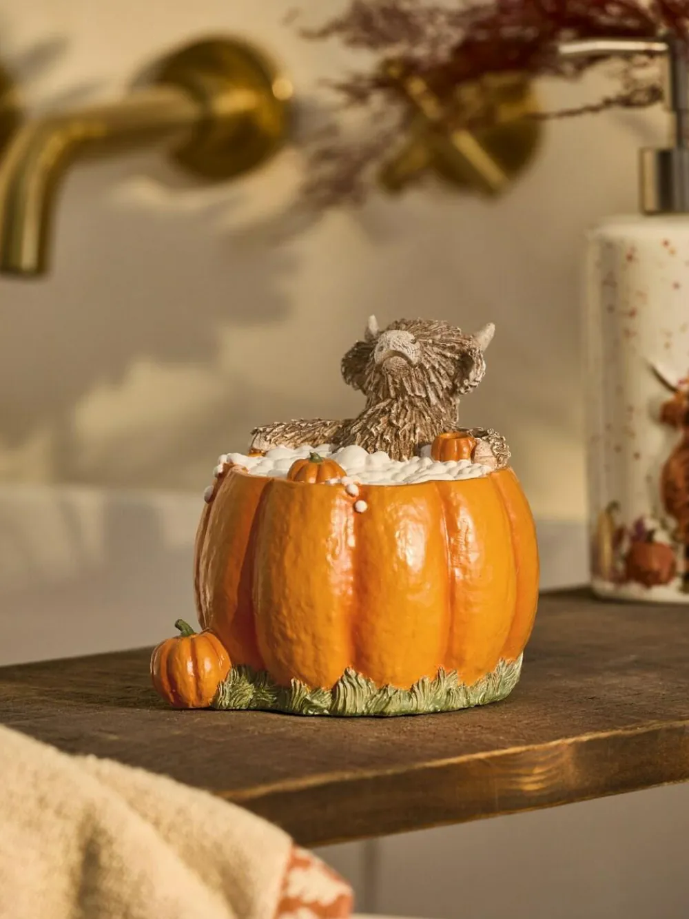 Hamish is relaxing in his Halloween Pumpkin bath-tub. Made from resin and hand decorated, this bathroom ornament is the perfect way to update your decor this Autumn. Height 11cm Width 10cm Depth 11cm 100% Resin. This item has been tested to ensure it is bathroom suitable and protects against corrosion and distortion from steam.