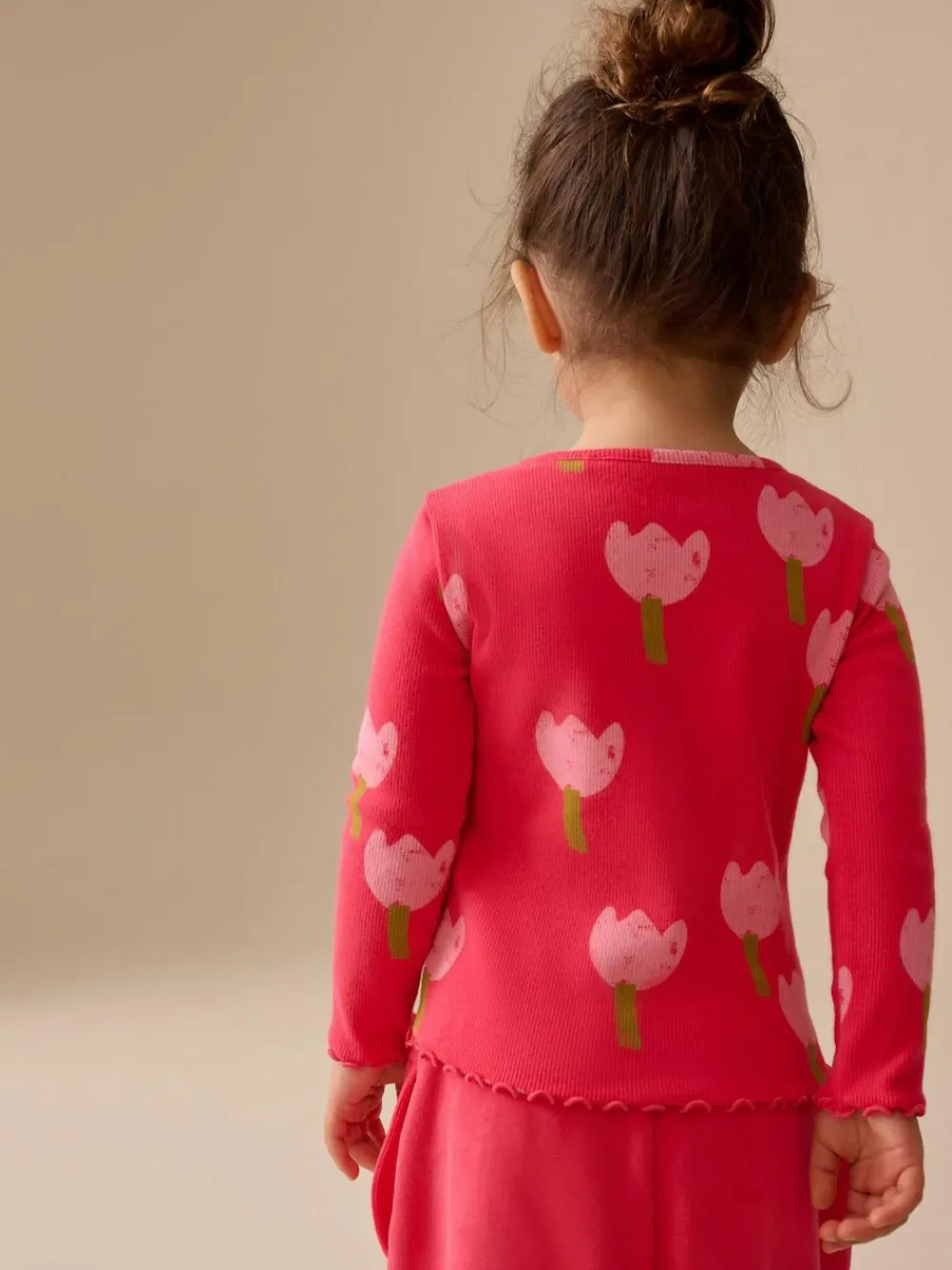 Add some fun to their everyday staples, with this Pink and Red long sleeve rib t-shirt with flowers, available in a selection of bright colours and prints, set against a cotton-rich base with added stretch. The t-shirt is finished with a ribbed crewneck collar and a ruffle trim the sleeve cuffs and hem. Cotton-rich blend Long sleeves Crewneck collar Ruffle trim Machine washable. 95% Cotton, 5% Elastane.