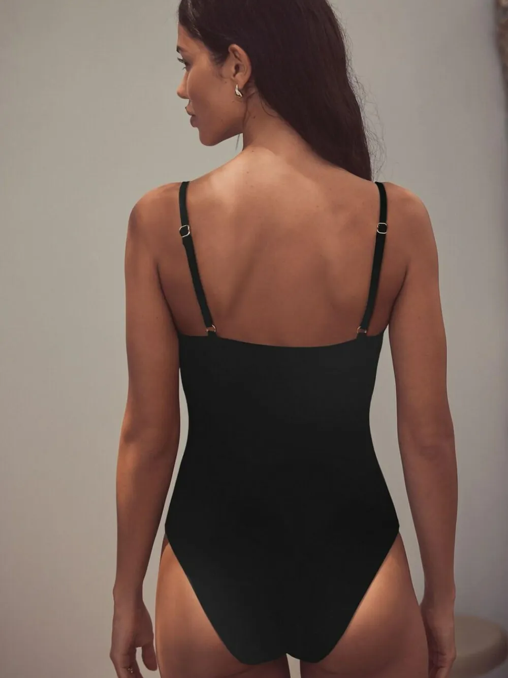 Make a summer style statement with this swimsuit. It features a plunging neckline and shaping mesh to the stomach for a smooth look. The swimsuit also includes central trim detailing and is made with SPF 50+ fabric. Plunge neckline Tummy control mesh SPF 50+ fabric Trim detailing Black/Green leaf print Main 85% Nylon, 15% LYCRA® XTRA LIFE™ elastane. Lining 92% Recycled polyester, 8% Elastane. Mesh 88% Nylon, 12% Elastane. Items with the curve logo are available in sizes 18 and above., Our tall collection is designed to fit women 5’10” and above. This has been proportionally increased through the body, leg and sleeve to achieve the perfect fit. Available in sizes 8-20.