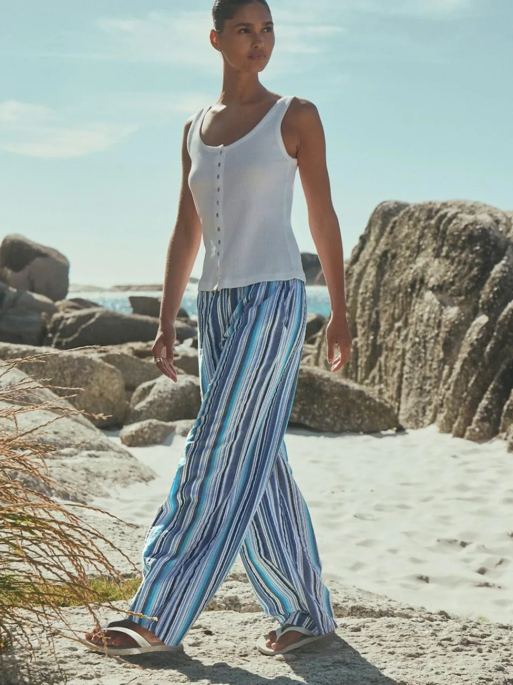 Embrace effortless holiday style with these lightweight wide-leg trousers, perfect for beach days or sunny strolls. Crafted from a woven stripe fabric in calming blue tones, the easy pull-on design ensures maximum comfort and a relaxed, breezy silhouette. Woven stripe fabric Elasticated waist band Wide leg style Pull on waist Short to fit inside leg 27″ / 69cm. Regular to fit inside leg 29″ / 74cm. Long to fit inside leg 31″ / 79cm. XL Tall to fit inside leg 33″ / 84cm. Machine washable. 100% Cotton. Items with the curve logo are available in sizes 18 and above., Our tall collection is designed to fit women 5’10” and above. This has been proportionally increased through the body, leg and sleeve to achieve the perfect fit. Available in sizes 8-20.