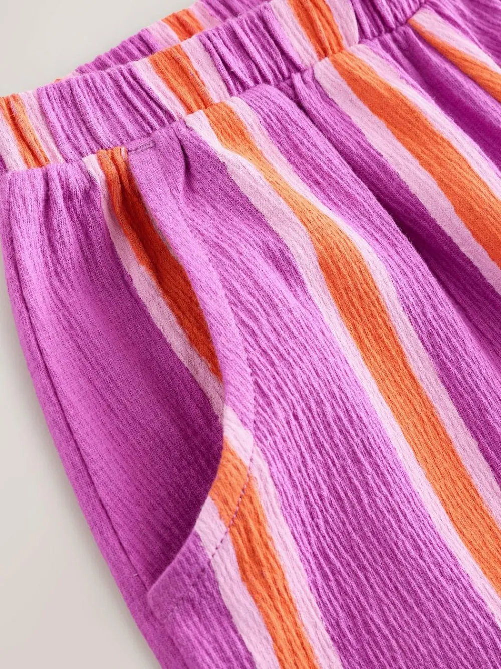 Introduce a vibrant and comfortable style with these Purple Orange Stripe Barrel Leg Trousers. Crafted from soft crinkle jersey fabric, they offer a lovely relaxed texture and easy movement. The fashionable Barrel Leg cut and bold stripe pattern make these easy to wear, perfect for casual outings and all-day comfort. Crinkle jersey fabric Barrel Leg Trousers Stripe pattern Elasticated waist Machine washable. 92% Cotton, 6% Recycled polyester, 2% Elastane.