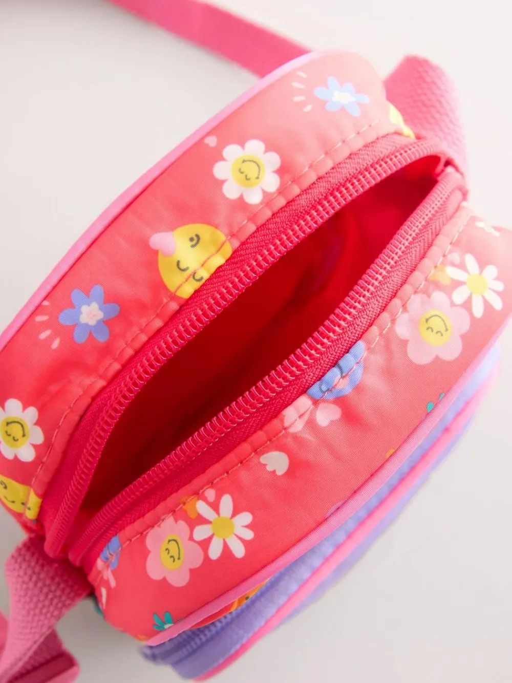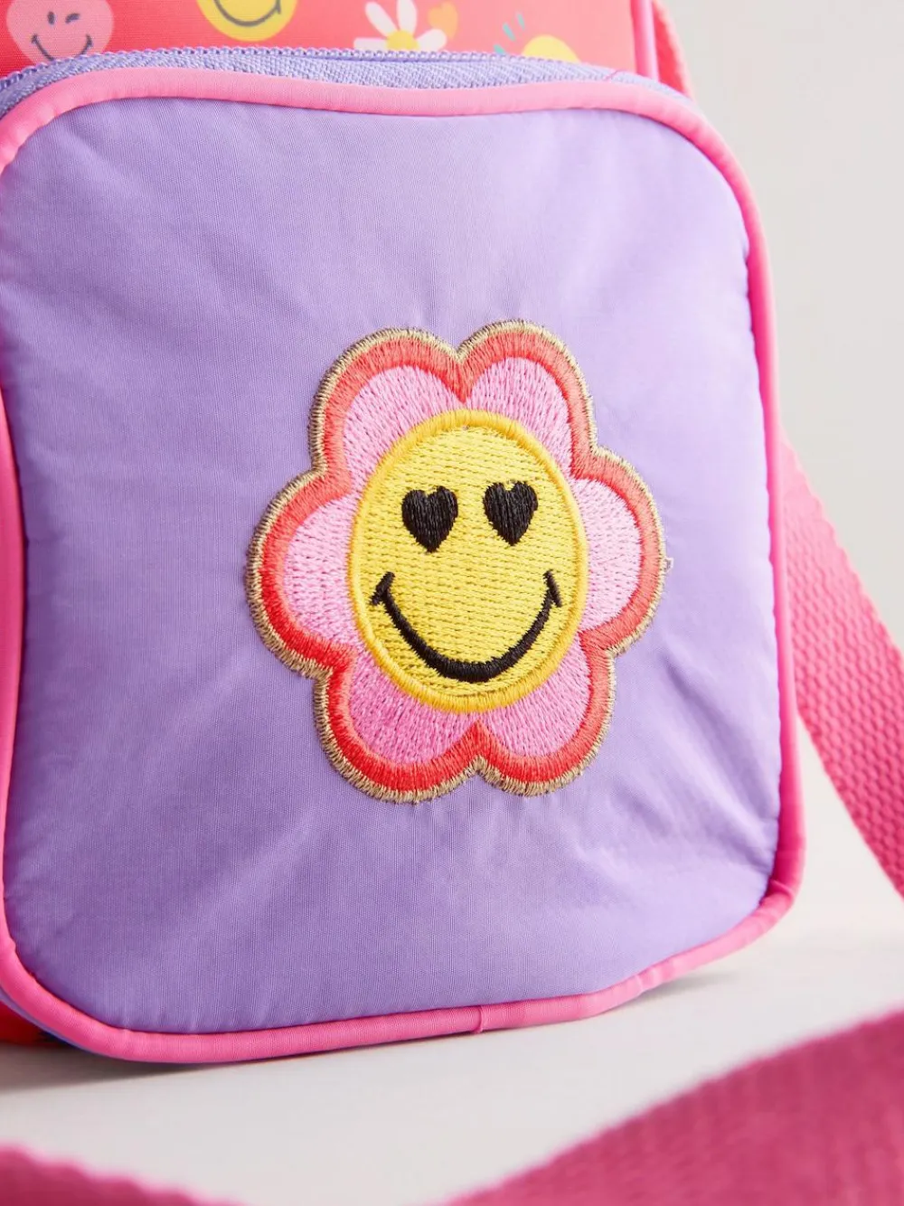 Colourful cross body bag to brighten up everyday outfits with classic smiley embroidered patch and playful printed details. Two zipped pockets and adjustable straps.Warning! Choking And Strangulation Hazard – Not Suitable For Children Under 36 Months Due To Small Parts And Long Straps. Height 17.5cm Width 10.5cm Depth 4cm Polyester Height 17.5cm Width 10.5cm Depth 4cm 100% Polyester.