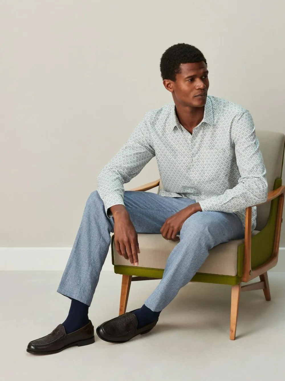 Add a sophisticated print to your workwear collection with this Floral Trellis Shirt. Featuring a subtle, detailed pattern in white and blue, this regular fit, long-sleeve shirt offers a polished look. It’s an excellent choice to brighten up your workwear or for smart-casual events. White & blue Button-through front Long sleeves with button cuffs Collared neckline Perfect for workwear Machine washable. 60% Cotton, 40% Recycled polyester.