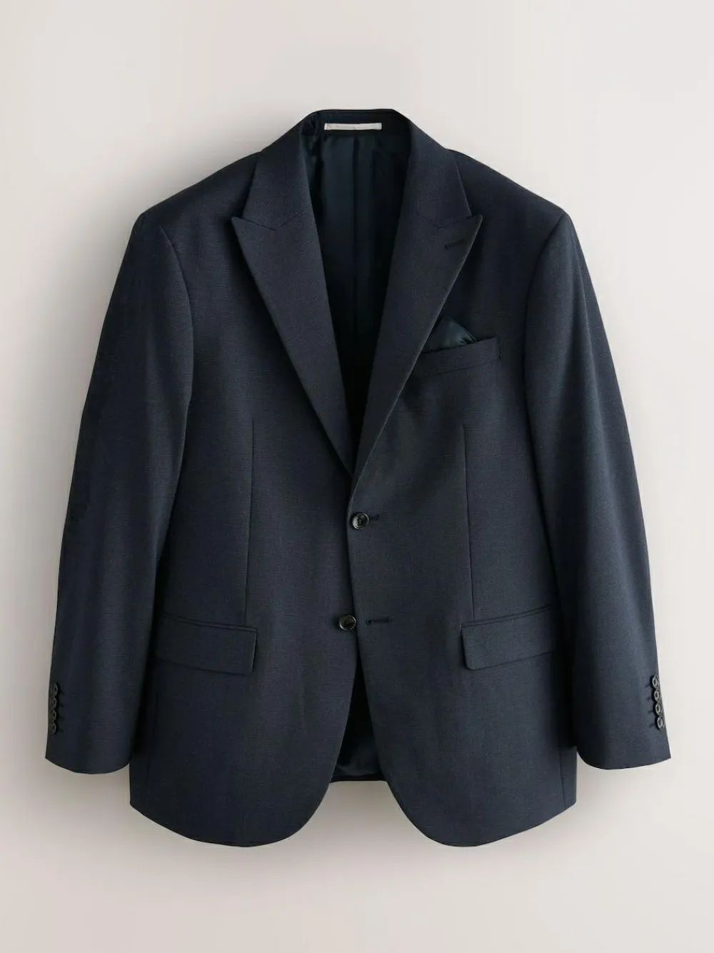 Effortlessly sharp, this navy suit jacket is a timeless wardrobe staple. The motionflex stretch fabric and regular fit provide ultimate comfort and a classic silhouette. With a peak lapel and a pull-out pocket square, this fully lined jacket is a perfect piece for both the office and formal events. Regular fit Motionflex stretch Peak lapel Pull-out pocket square Fully lined Check out The Suit Shop for more inspiration:https://www.next.co.uk/men/the-suit-shop Main 68% Recycled polyester, 28% Viscose, 4% Elastane. Lining 100% Recycled polyester.