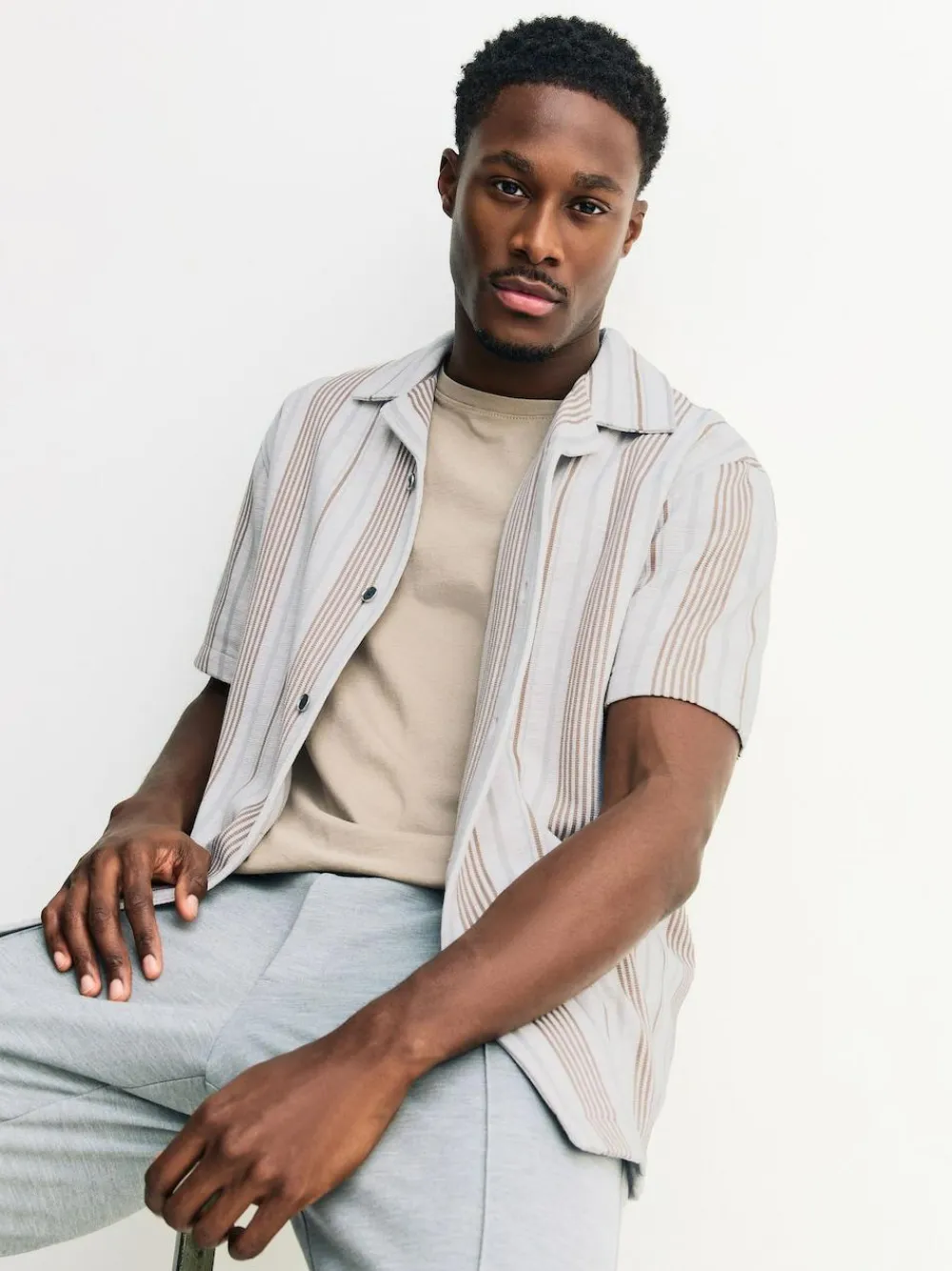 Step into summer with this stylish jersey shirt, featuring a classic stripe design. Designed with a relaxed revere collar and short sleeves, this lightweight piece is perfect for holidays or casual warm-weather styling. A versatile and comfortable choice for a modern, sun-ready look. Stripe design Revere collar Short sleeve Jersey fabric Machine washable. 75% Recycled polyester, 23% Viscose, 2% Elastane.