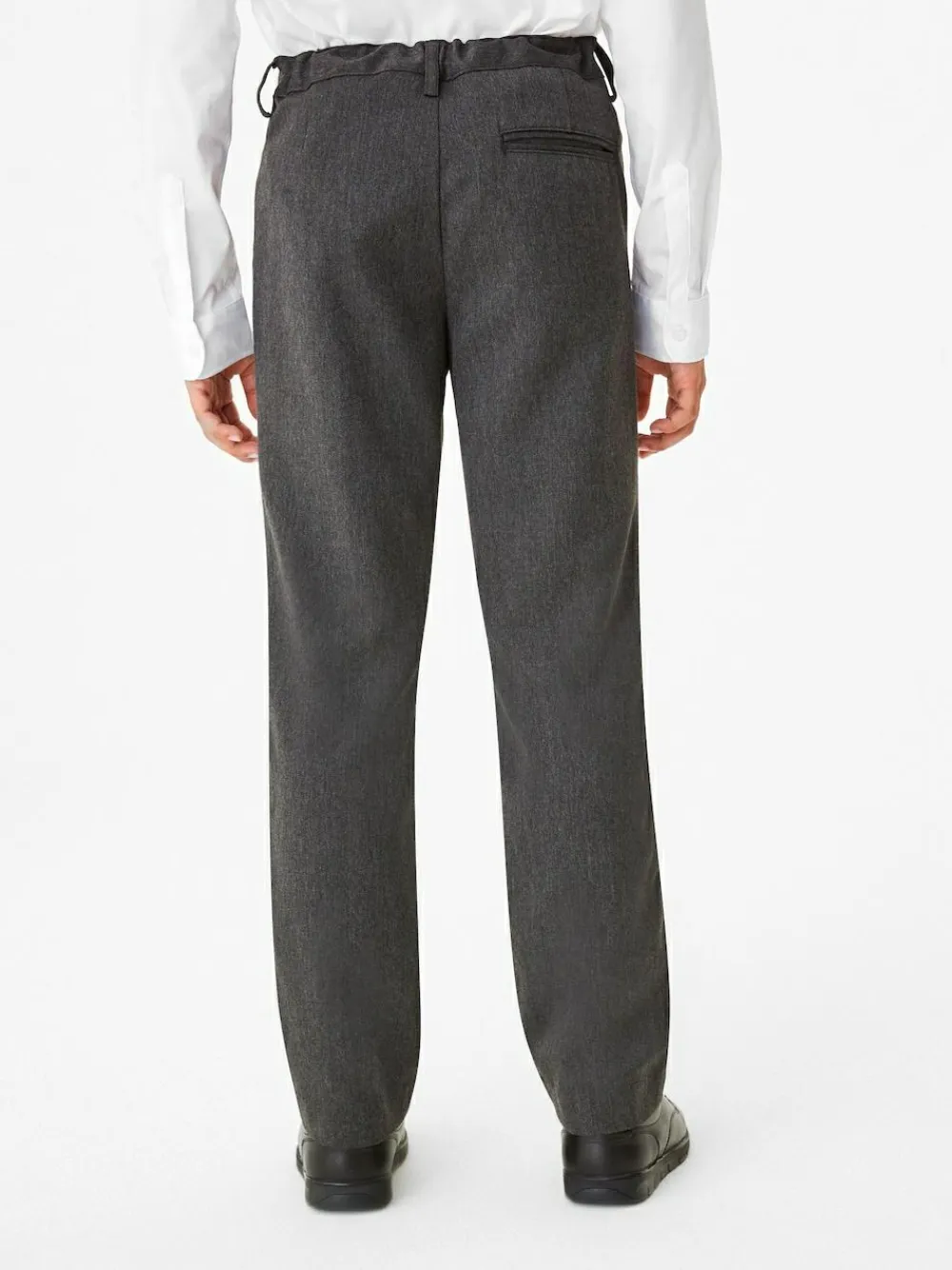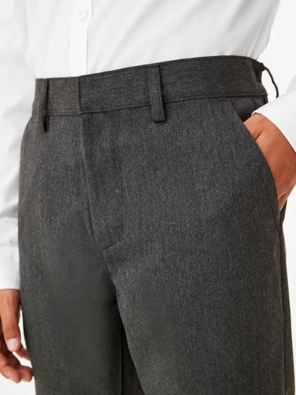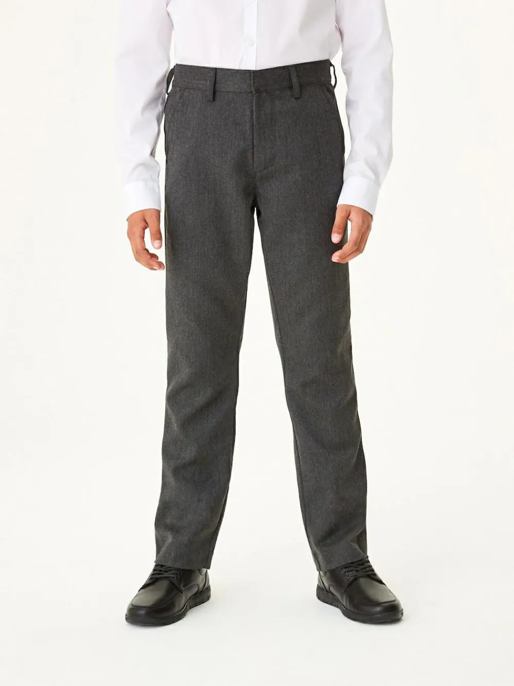Go back to school in style with our formal straight trousers in grey. The adjustable waist and straight leg silhouette make these flat-front trousers a stylish addition to their school uniform. Made with an easy iron fabric and with a hook and bar fastening with zip fly. Key Features: Easy Iron fabric – Handy easy-iron finish Teflon® Technology – a treatment that repels water and water-based stains for easy cleaning and quick drying Machine washable Adjustable waist Flat front Straight leg style Machine washable. 65% Recycled polyester, 35% LENZING™ ECOVERO™ Viscose. This product is made with teflon. Teflon® is a registered trademark of DuPont.