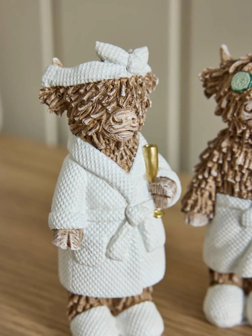 Add some character to your bathroom with our adorable set of 2 Hamish the Highland Cow ornaments who are enjoying themselves being pampered at the spa. Set of 2 ornaments 100% resin Height 11cm Width 6cm Depth 4.5cm 100% Resin. This item has been tested to ensure it is bathroom suitable and protects against corrosion and distortion from steam.