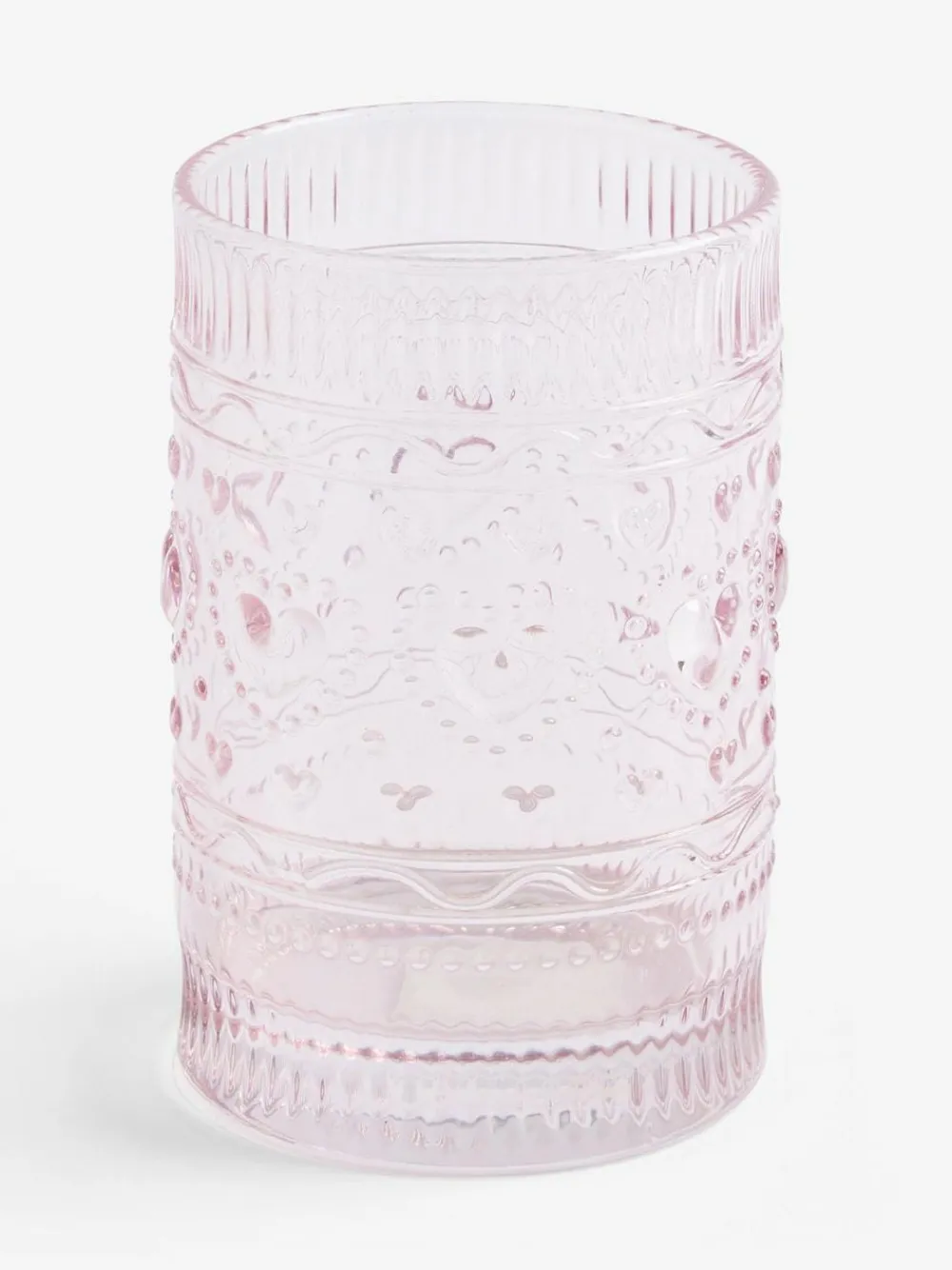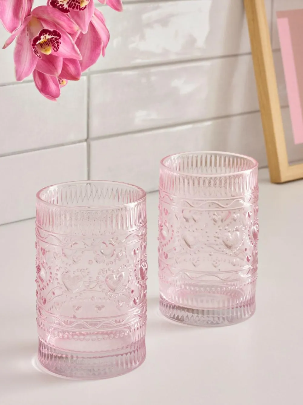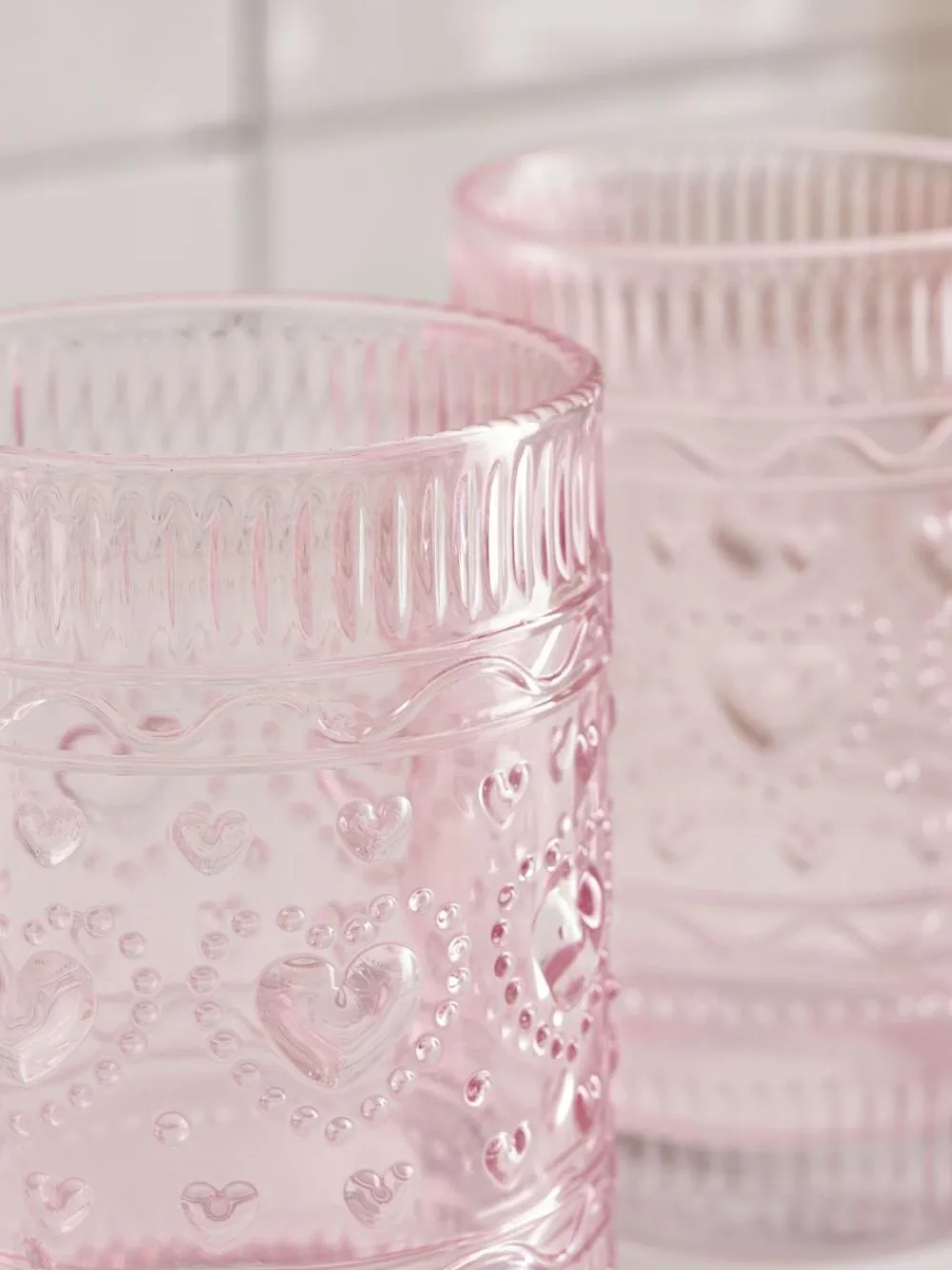 Add a sweet touch to your glassware collection with this set of 2 pink tumblers, each featuring a delicate pressed heart design. Crafted from high-quality glass, these tumblers combine charm and durability, making them perfect for everything from casual sips to special moments. Height 12.5cm Hand wash only. 100% Glass.