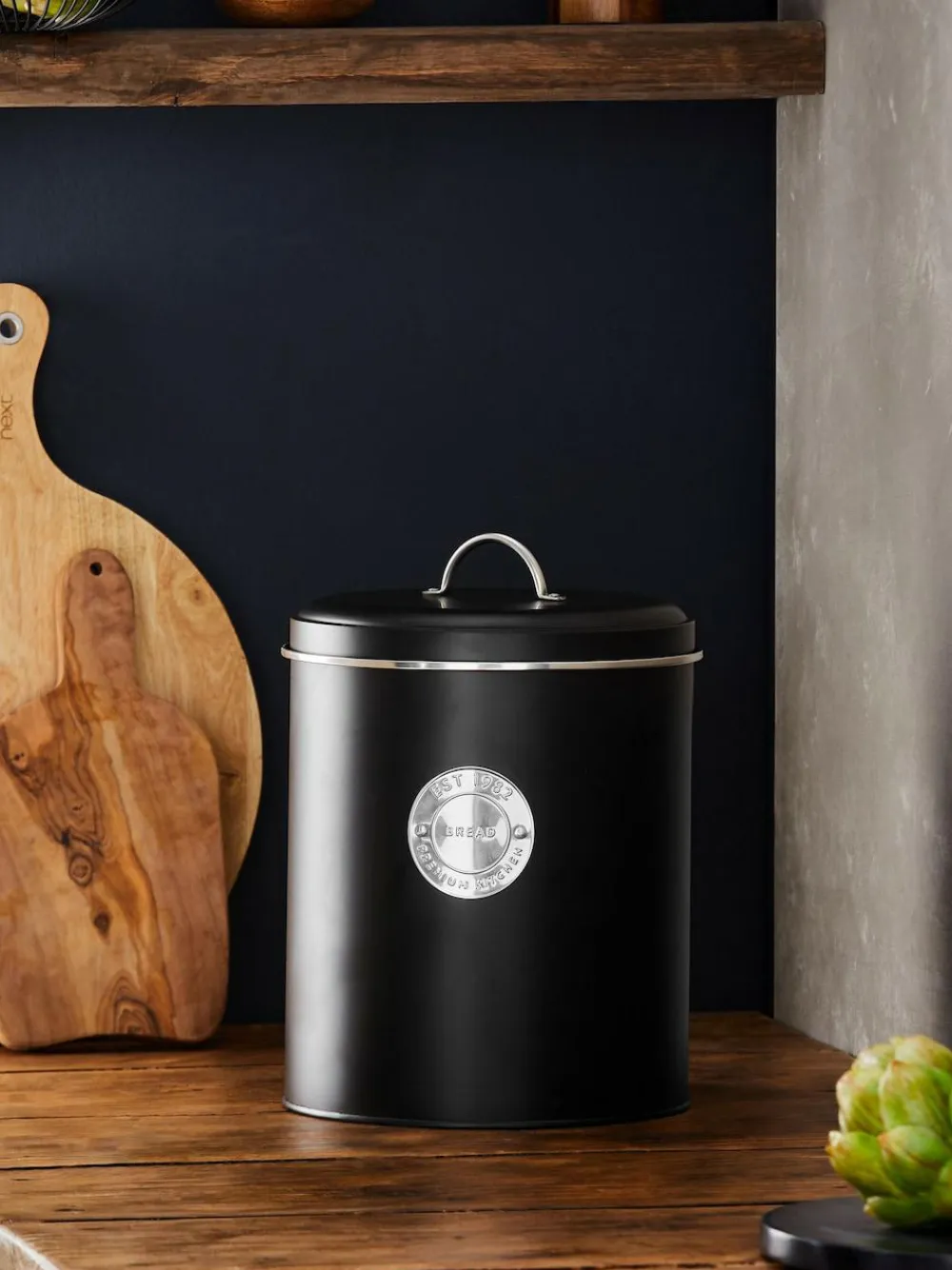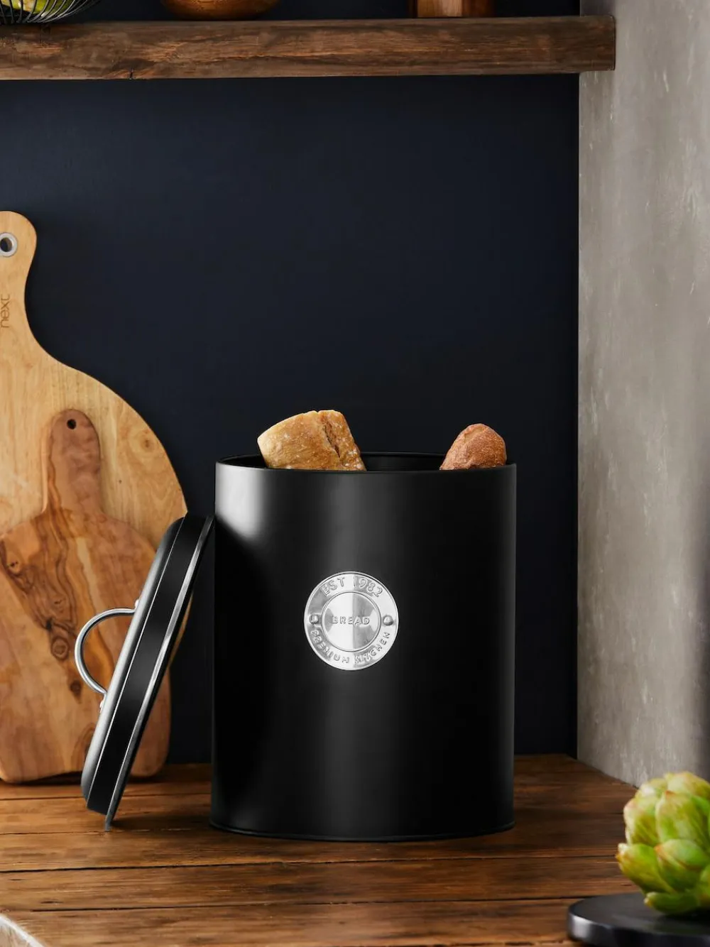 Keep your bread and treats fresh and your worktop tidy with this metal bread bin and treat jar set. With a timeless black design, the bread bin is finished with embossed badge detailing and a handled lid. 100% metal Classic bread bin Badge design Handled lid Height 30cm Width 23.5cm Depth 22.5cm Wipe clean only. 100% Metal.