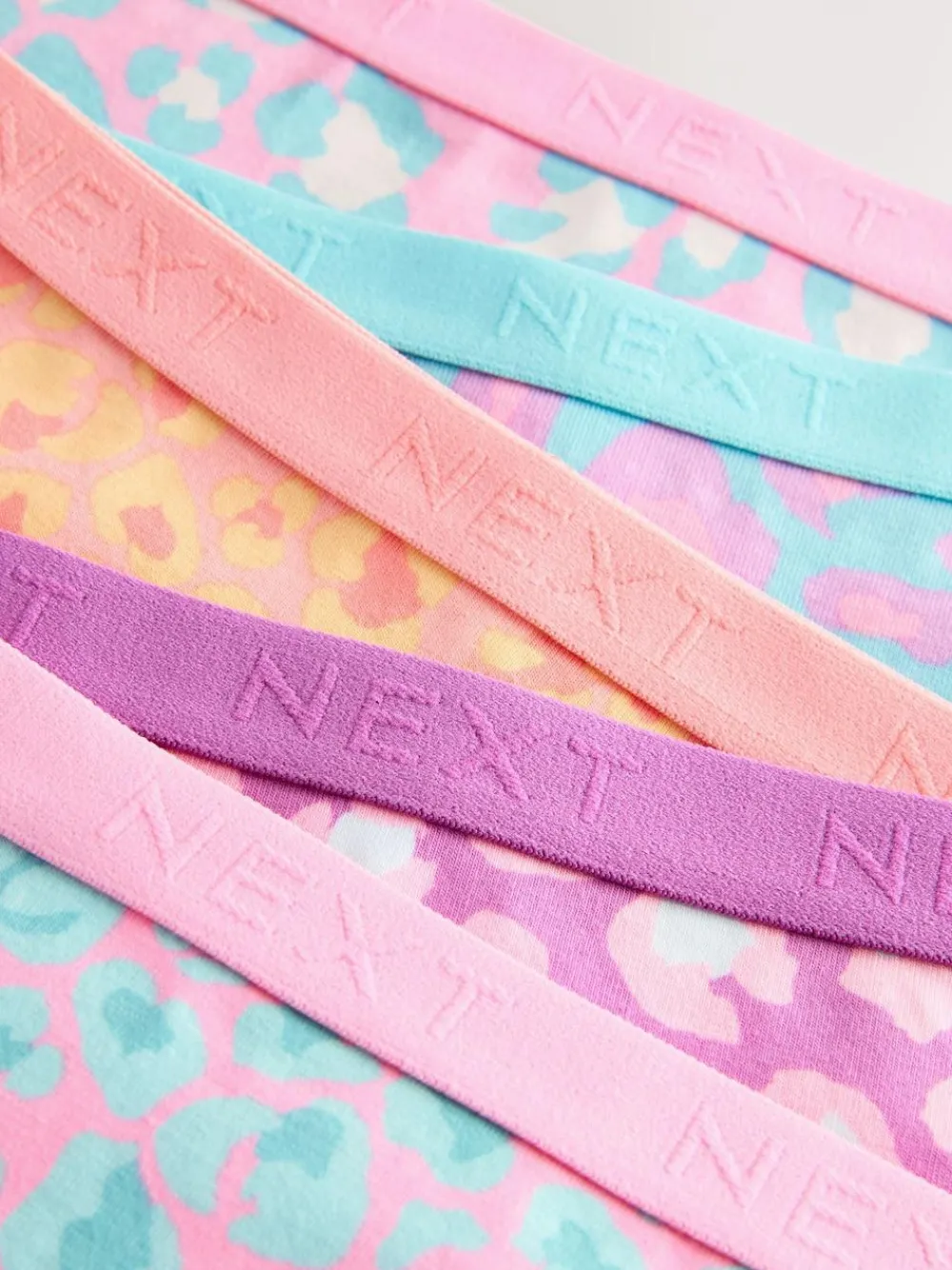 This 5-pack of short briefs are available in bright and fun all-over prints and colours, made from a cotton-rich fabric with added stretch and finished with a branded NEXT elasticated waistband. Our short briefs are a high rise, full coverage shape with a short leg, a double layered gusset and a soft twin needle hem finish. 5-pack Cotton-rich fabric All-over prints Elasticated waistband Machine washable. 5 x Knickers 95% Cotton, 5% LYCRA® XTRA LIFE™ elastane. LYCRA® XTRA LIFE™ fibre keeps your underwear looking new for longer, with lasting comfort and fit. This innovative stretch fabric is lightweight and breathable and will hold its shape wear after wear, wash after wash.