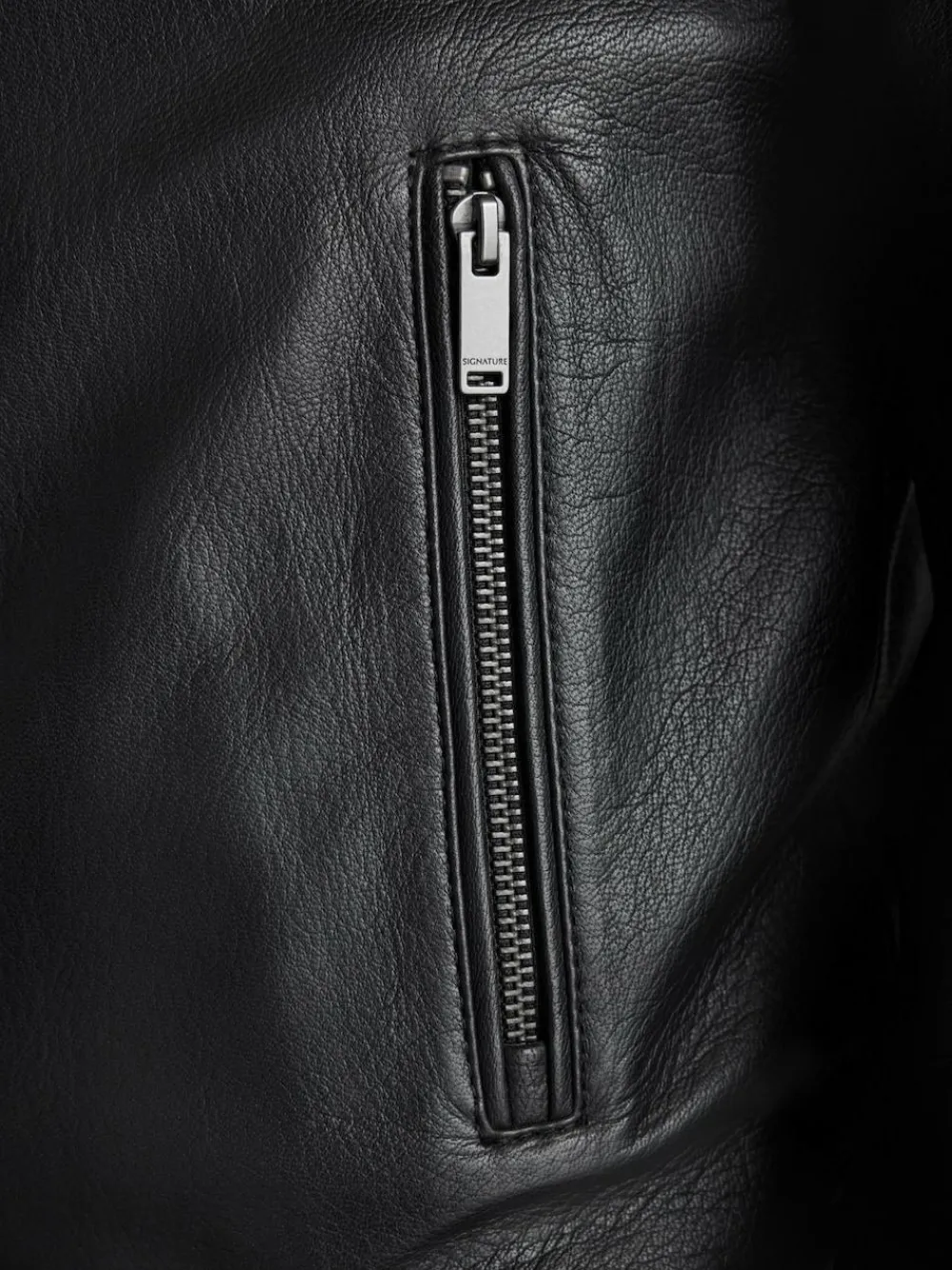 The bomber is a timeless piece of menswear, versatile and trendy it can dress a look up as much as it can pare one down. This edgy Signature leather bomber jacket is an original and timeless outerwear option. Complete with internal welt pocket, gunmetal trims and ribbed hem and cuffs, it is a wardrobe must that will transition you through the seasons. Leather bomber jacket Internal welt pocket Gunmetal trims Ribbed hem and cuffs Specialist dry clean. Shell 100% Leather. Lining 53% Viscose, 47% Polyester. Rib 84% Cotton, 13% Polyester, 3% Elastane.
