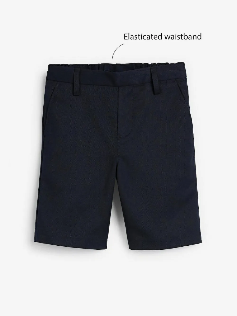 Keep him smart & stylish with these easy-to-wear pull-on navy blue school shorts. The mock fly front and easy pull-on style make these hassle-free to pop on and off and the adjustable waist ensures the perfect fit. Complete with an easy iron finish, these really are the perfect pair for his summer uniform.Key features Easy Iron Fabric – Handy easy-iron finish Teflon® Technology – a treatment that repels water and water-based stains for easy cleaning and quick drying Machine washable Flat front Pull-on waist Machine washable. 65% Recycled polyester, 35% LENZING™ ECOVERO™ Viscose.
