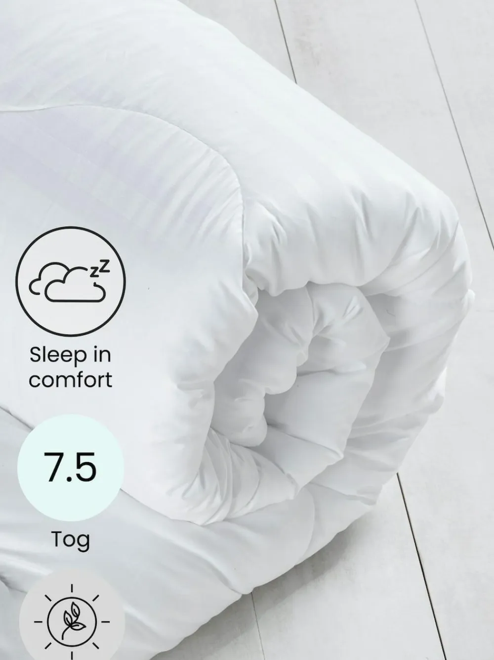 Sleep in Comfort RangeThis lightweight duvet is incredibly comfortable. Designed to drape with a soft-touch peach skin microfibre cover which is finished with a wave stitch design. Available in a range of tog weights to suit your needs. The all-season duvet contains both 7.5 and 10.5 tog duvets that can be easily clipped together or used separately to suit the weather.Key FeaturesLightweight duvetMicrofibre coverProduct DimensionsSingle: 135 x 200cmDouble: 200 x 200cmKing: 230 x 220cmSuperking: 260 x 220cmTog ratings3 Tog: Suitable for warm summer nights4.5 Tog: Suitable for summer nights7.5 Tog: Suitable for spring & summer10.5 Tog: Suitable for all year round13.5 Tog: Suitable for cold winter nights15 Tog: Suitable for cold winter nights For top tips on choosing the best duvets and pillows for you read our handy guide here. Machine washable. Cover 100% Recycled polyester. Filling 100% Recycled polyester.