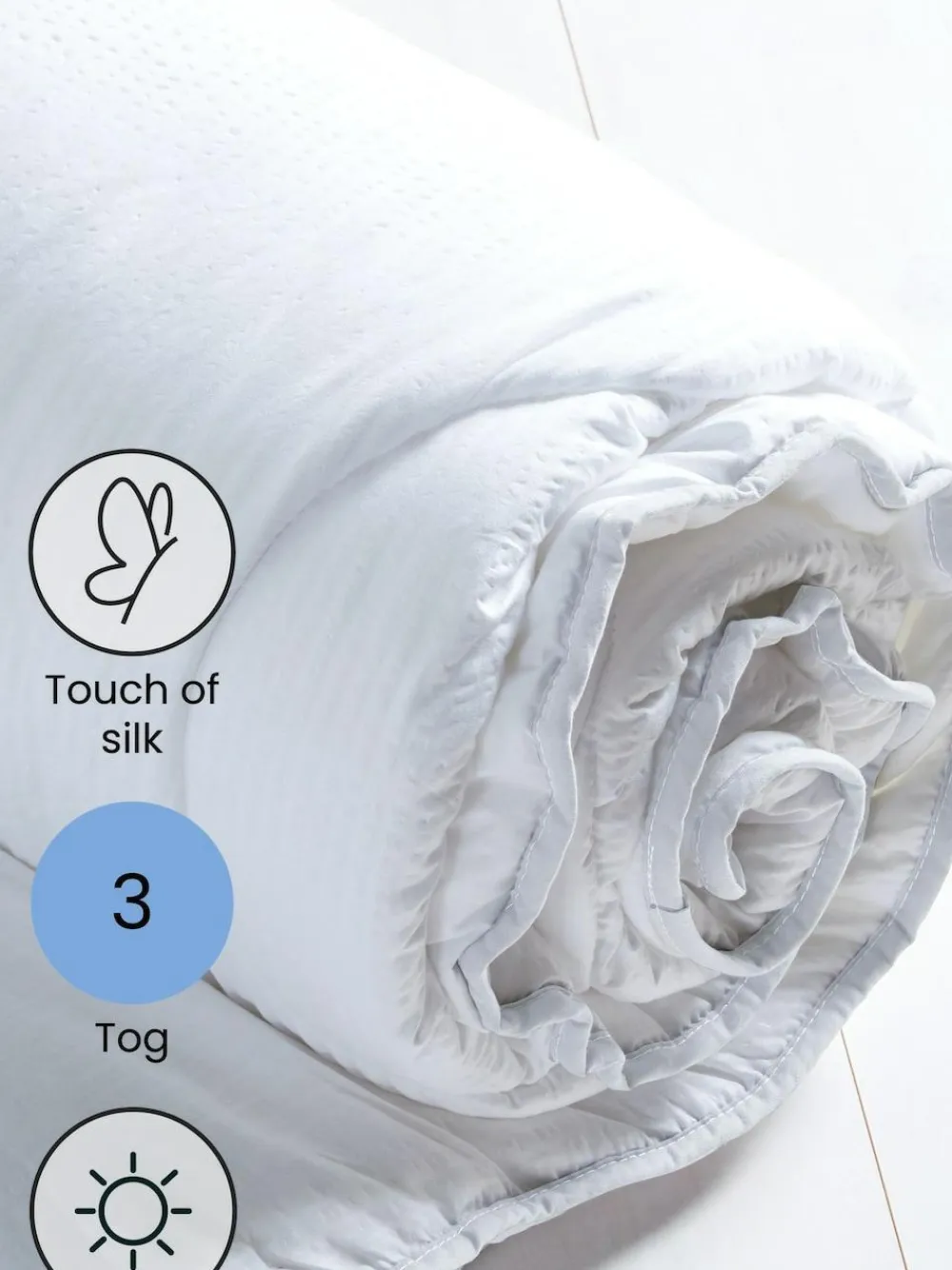 Sleep In Silk Range Immerse yourself in sleep with our touch of silk duvet, offering the ideal mix of comfort with a lightweight feel. With a hint of natural silk blended in, this duvet is as soft as a cloud, and its seersucker detail adds an extra point of interest to your bedding. Available in a range of togs to suit your needs. Key Features: 3 Tog Duvet Silk Feel Product Dimensions: Single: 135 x 200cm Double: 200 x 200cm King: 230 x 220cm Superking: 260 x 220cm Tog ratings: 3 Tog: Suitable for warm summer nights 4.5 Tog: Suitable for summer nights 7.5 Tog: Suitable for spring & summer 10.5 Tog: Suitable for all year round 13.5 Tog: Suitable for cold winter nights 15 Tog: Suitable for cold winter nights For top tips on choosing the best duvets and pillows for you read our handy guide here. Machine washable. Cover 100% Recycled polyester. Filling 95% Recycled polyester, 5% Silk.