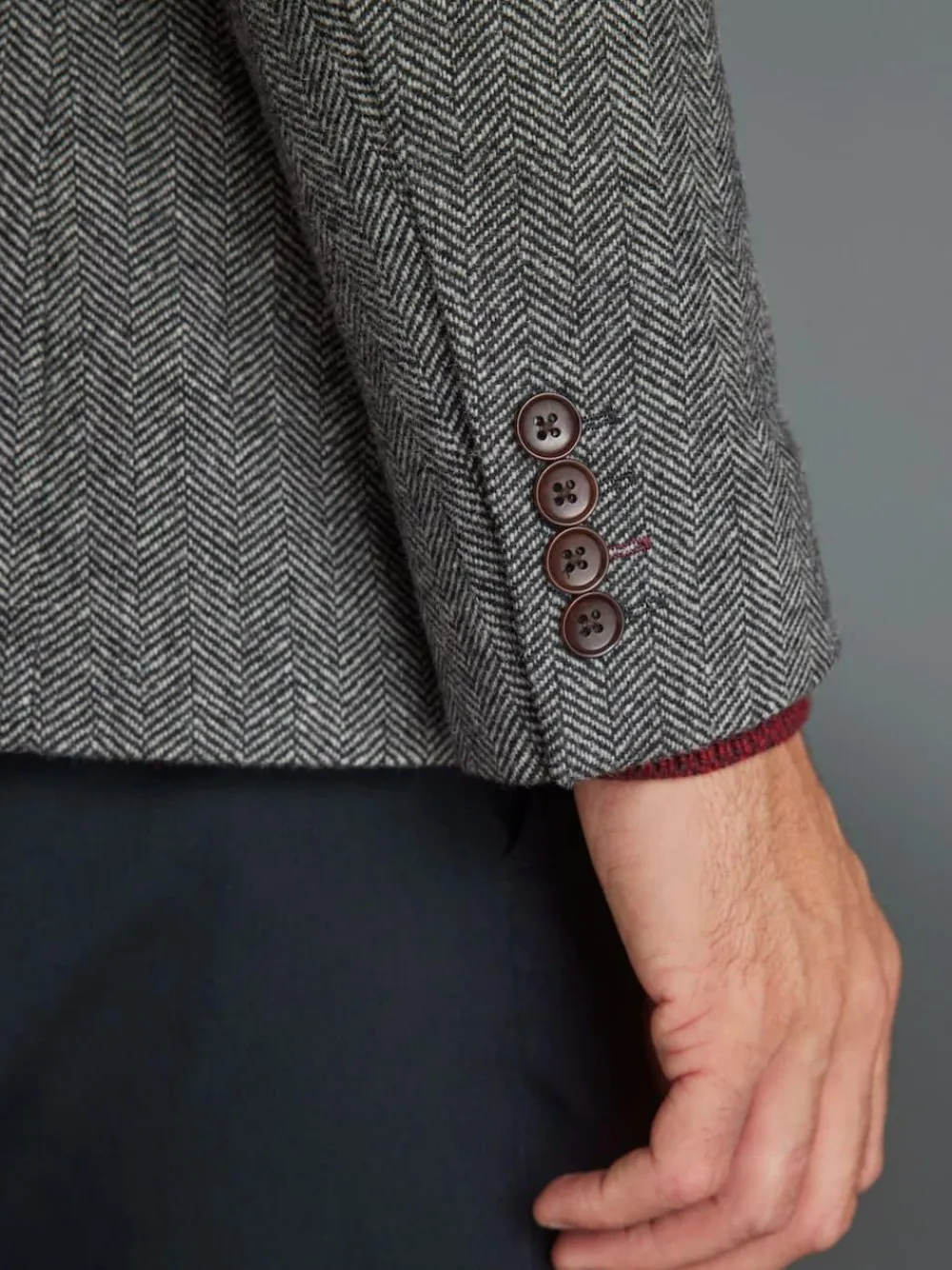Made with fine Italian wool from Nova Fides, this classic herringbone jacket is a quintessentially British working wardrobe addition. Finished with contrast corozo buttons and a stylishly printed internal lining. Linings may differ in imagery. Lapel pins and pocket square not included. Since the 1960s, Nova Fides has been based in the Prato textile district creating fine weaves and fabrics for Men’s clothing. Italian wool Classic herringbone jacket Corozo buttons Printed internal lining Dry clean only. Main 46% Wool, 20% Acrylic, 18% Polyester, 14% Nylon, 2% Other fibres. Lining 65% Recycled polyester, 35% Viscose.