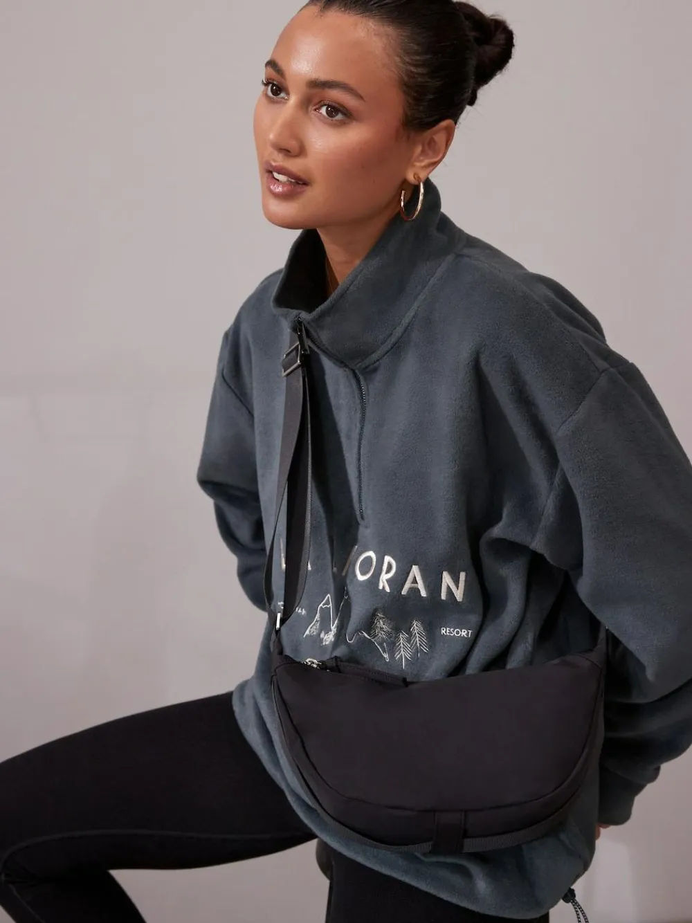 This black sling bag is perfect for carrying your small daily essentials, with a raffia design that brings the holiday vibe from the airport to the beach bar. The bag has an adjustable shoulder strap with a zippered main pocket. Sling bag Raffia design Adjustable shoulder strap Zippered main compartment Height 15.5cm Width 30cm Depth 9.5cm Main 100% Polyester. Lining 100% Recycled polyester.