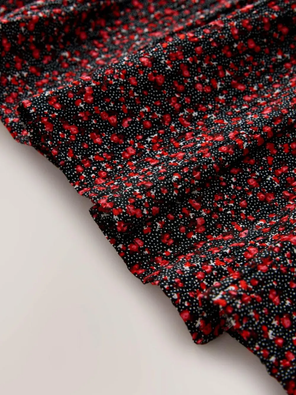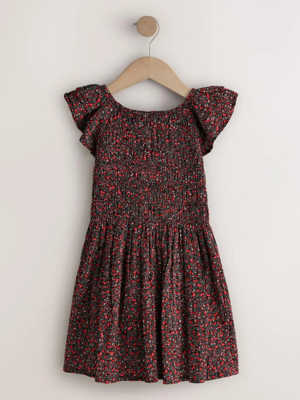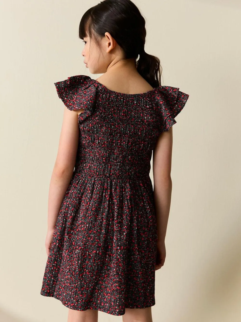 This charming Black Ditsy Smocked Frill Sleeve Dress is a pretty addition to her wardrobe. The dress features a delicate ditsy print against a black background. It has a smocked bodice and frill sleeves. Ditsy print Smocked bodice Frill sleeves Dress style 99% Cotton, 1% Elastane.