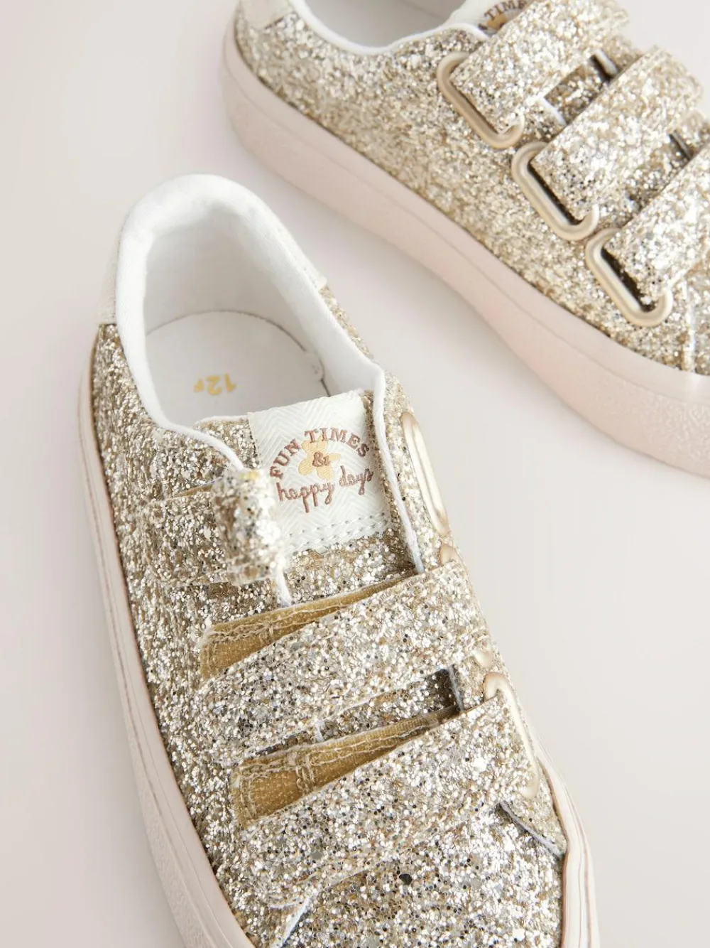 These classic gold glitter trainers standard fit trainers have a stylish casual design featuring a faux leather upper, three touch fastened straps for easy wear and a round toe. A textile lining ensures comfortable wear, finished with a slip-resistant outsole. Standard fit (F) Faux leather upper Round toe Touch-fastened straps Textile lining Slip-resistant outsole Upper – Textile, Lining & Sock – Textile, Sole – Other Materials.