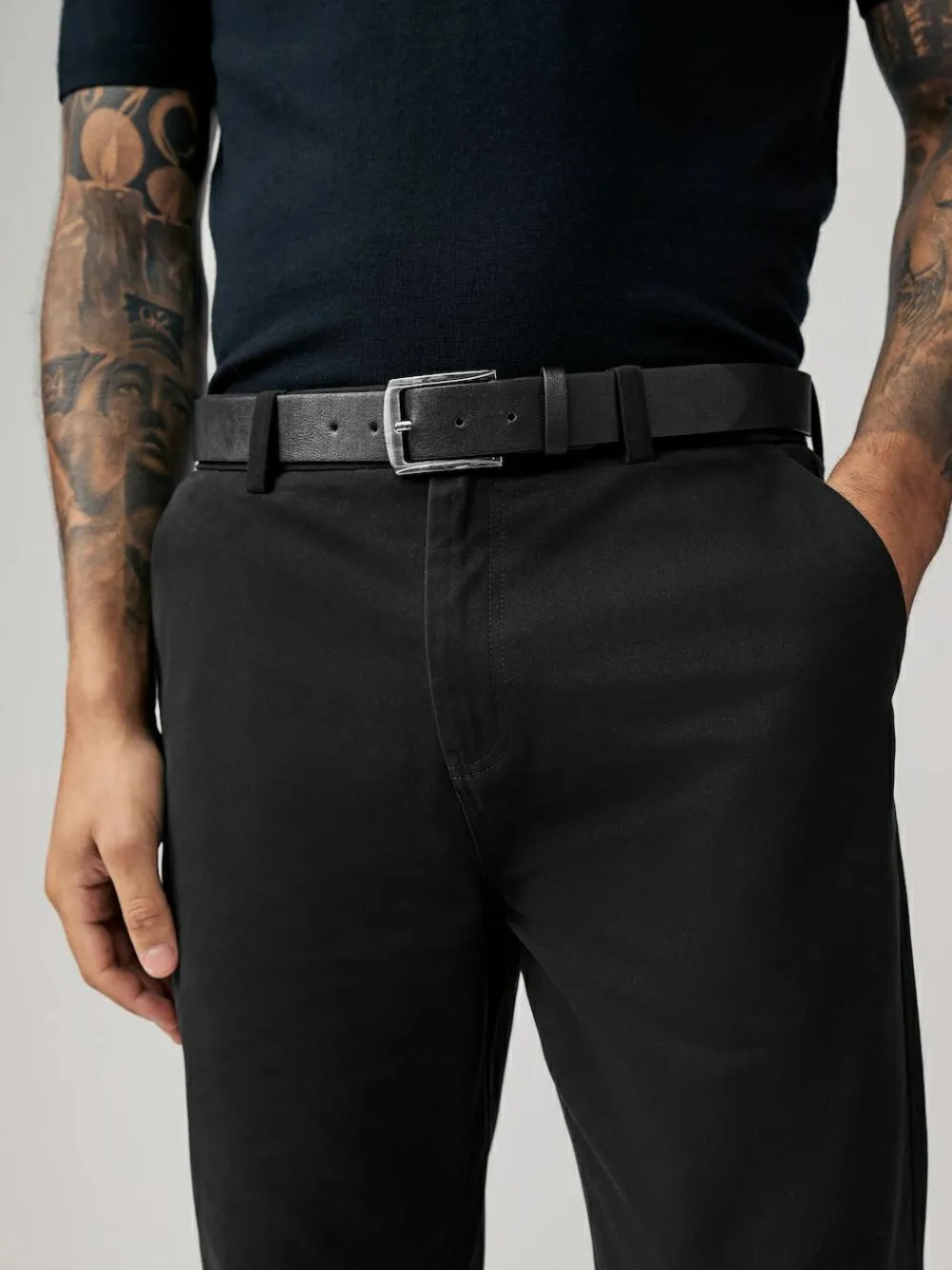 Made from a cotton-rich blend and woven with stretch for added comfort, these luxurious soft-touch chinos feature a faux leather belt to take styling out of the equation.Roll the hems and team with some trainers and a T-Shirt for an easy everyday look, or pair with some knitwear for a smarter style.Two side pockets and two reverse welt pockets hold all of your essentials. With a zip fly fastening. Machine washable. Trouser 98% Cotton, 2% Elastane. Belt 100% PU.