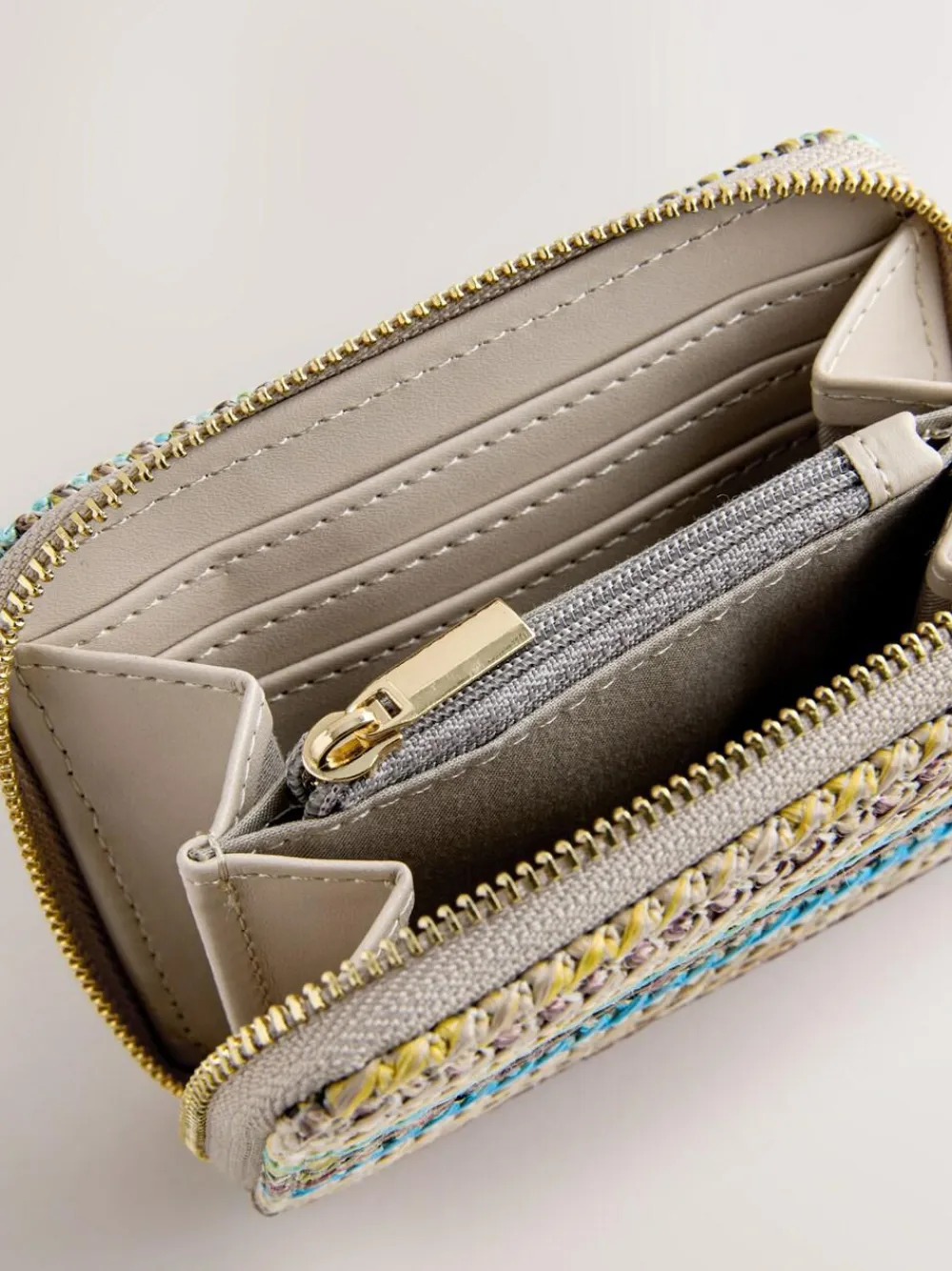 Organise your essentials in style with this vibrant stripe raffia effect purse, perfect for adding a touch of summer to your daily routine. This practical accessory features a secure zip-around fastening and multiple internal compartments, ensuring your cards and coins stay neatly arranged while you are on the move. Raffia effect fabric Zip around purse Internal compartments Stripe pattern Height 9cm Width 11cm Depth 2cm Outer 100% Polypropylene. Lining 100% Recycled polyester. Trim 100% PU.