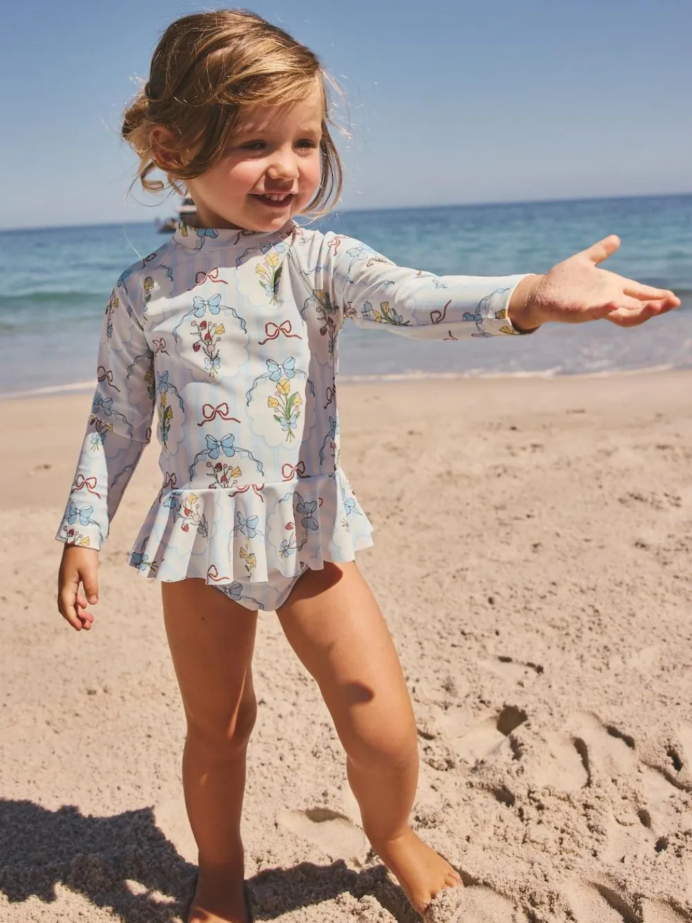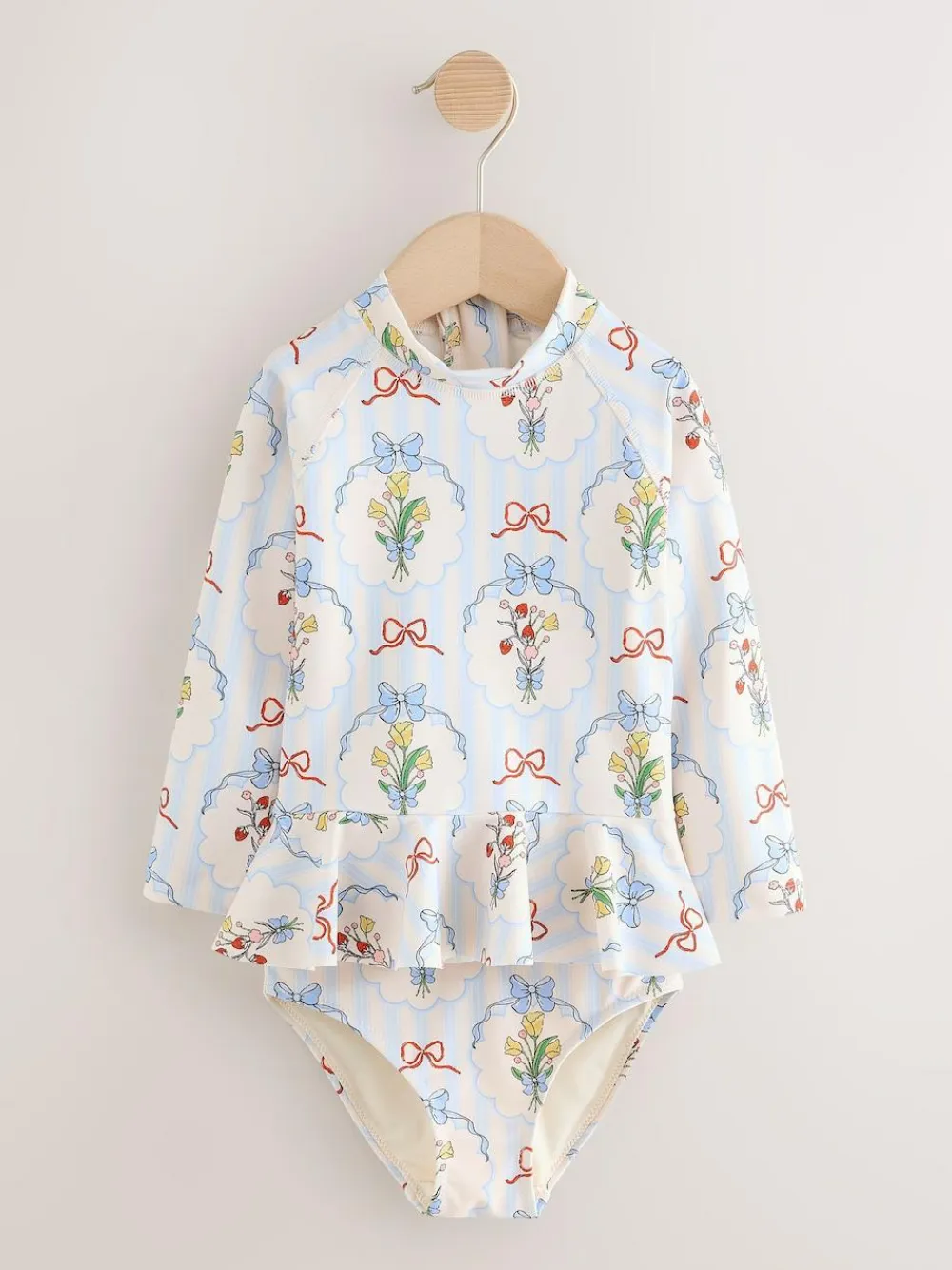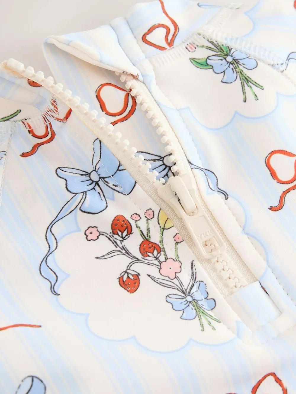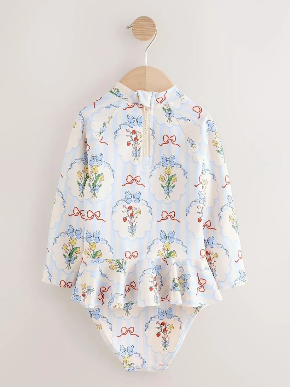 This gorgeous blue and white swim set keeps them safe in the sun without sacrificing style, featuring a long sleeve top with a tall neck, a zip fastening up to ages 12-18 months and ruffle detailing, alongside a pair of matching shorts. A UPF rating of 50+ protects against the sun’s rays on covered areas. 2-piece set Long sleeve swim top Tall neck Zip fastening Ruffle detailing Matching shorts UPF rating of 50+ Machine washable. Sunsafe Top 82% Recycled polyester, 18% Elastane. Swim Short Main 82% Recycled polyester, 18% Elastane. Lining 92% Recycled polyester, 8% Elastane. This fabric will provide protection against solar ultraviolet radiation. It has been independently tested and given a UPF rating of 50+ which blocks more than 97.5% of UV rays. Important Advice: • Sun exposure causes skin damage • Only covered areas are protected • Always use a high protection factor sunscreen on any exposed areas of skin • The protection offered by this fabric may be reduced with use or if stretched or wet • Always rinse in fresh water after each use • Young children should be kept in the shade between 11 and 3 • Don’t forget your hat and sunglasses. • Fabric provides UVA +UVB protection from the sun.