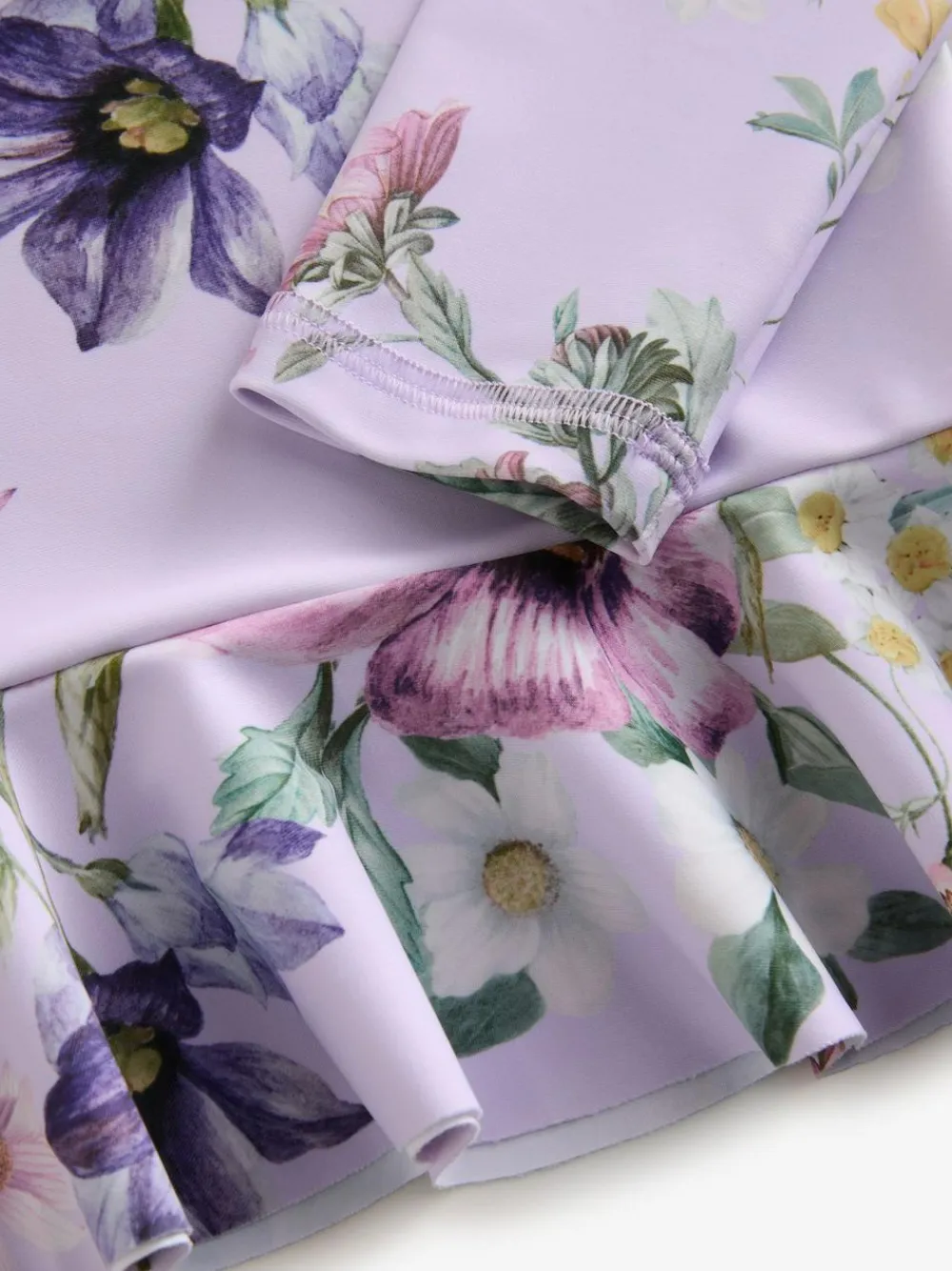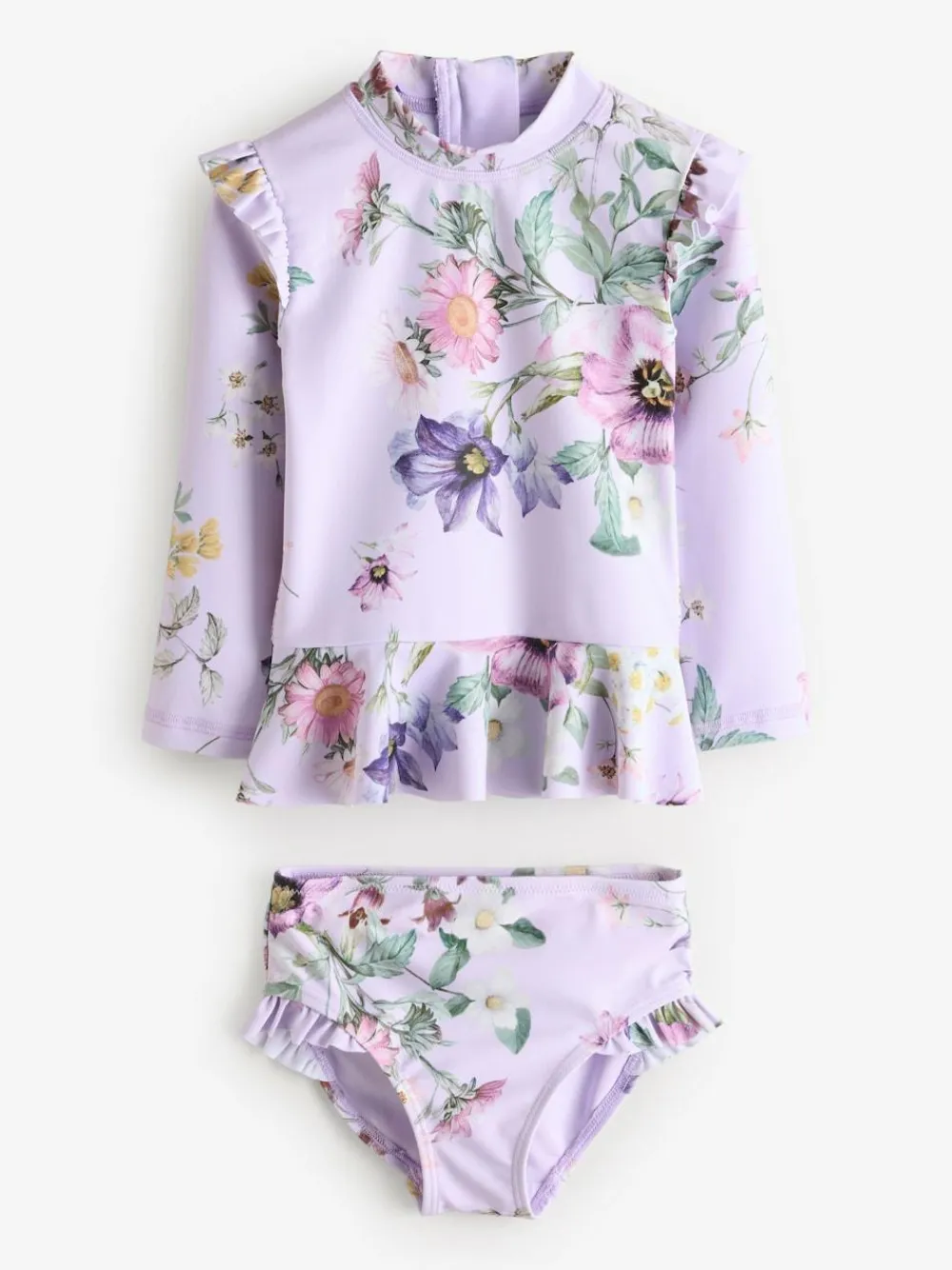 This gorgeous lilac purple floral print swim set keeps them safe in the sun without sacrificing style, featuring a long sleeve top with a tall neck, a zip fastening up to ages 12-18 months and ruffle detailing, alongside a pair of matching shorts. A UPF rating of 50+ protects against the sun’s rays on covered areas. 2-piece set Long sleeve swim top Tall neck Zip fastening Ruffle detailing Matching shorts UPF rating of 50+ Sunsafe Top 82% Recycled polyester, 18% Elastane. Bikini Bottom Main 82% Recycled polyester, 18% Elastane. Lining 92% Recycled polyester, 8% Elastane. This fabric will provide protection against solar ultraviolet radiation. It has been independently tested and given a UPF rating of 50+ which blocks more than 97.5% of UV rays. Important Advice: • Sun exposure causes skin damage • Only covered areas are protected • Always use a high protection factor sunscreen on any exposed areas of skin • The protection offered by this fabric may be reduced with use or if stretched or wet • Always rinse in fresh water after each use • Young children should be kept in the shade between 11 and 3 • Don’t forget your hat and sunglasses. • Fabric provides UVA +UVB protection from the sun.
