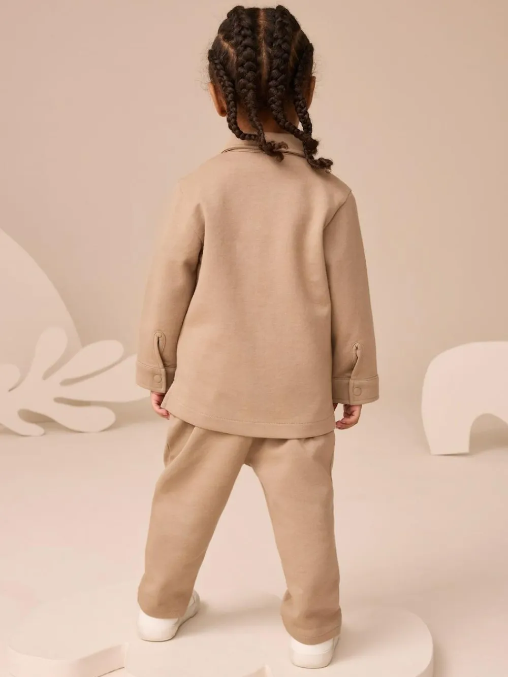 Give him an instantly polished smart casual look with this Tan Brown Shirt, T-Shirt And Joggers 3 Piece Set. This complete outfit includes a soft, collared overshirt that fastens easily with a popper front, featuring two stylish patch pockets to the chest. The jacket is perfectly layered over a T-shirt and paired with comfortable, matching joggers that have a drawstring waist. Ready to wear right off the hanger, this set is a simple way to achieve a cool, coordinated style. 3 piece set Popper front shirt Long sleeve t-shirt Matching joggers Machine washable. Jacket and Jogger 80% Cotton, 20% Recycled polyester. T-shirt 100% Cotton.