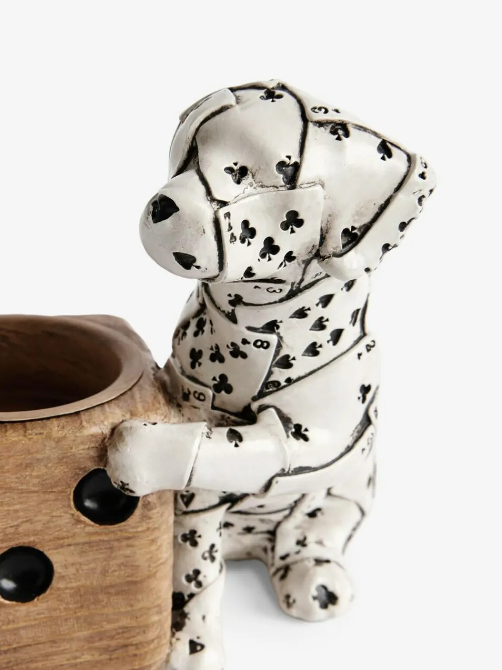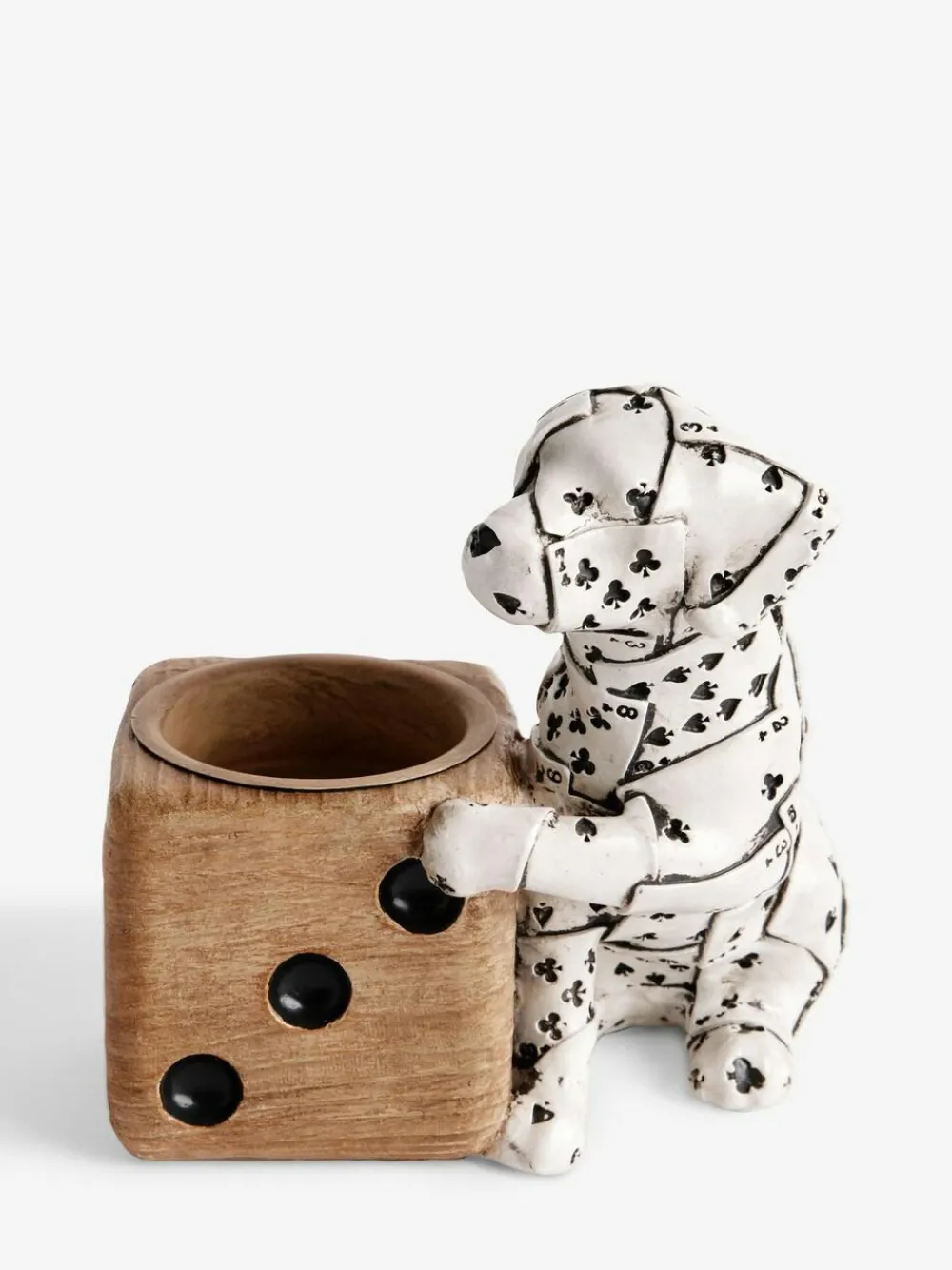 Add a touch of whimsy to your home with Ace, the adorable Dalmatian tea light holder. Featuring a unique dice-shaped base, this charming piece is sure to brighten any room. Tea light not included. Height 12cm Width 10.5cm Depth 11.5cm 100% Resin.