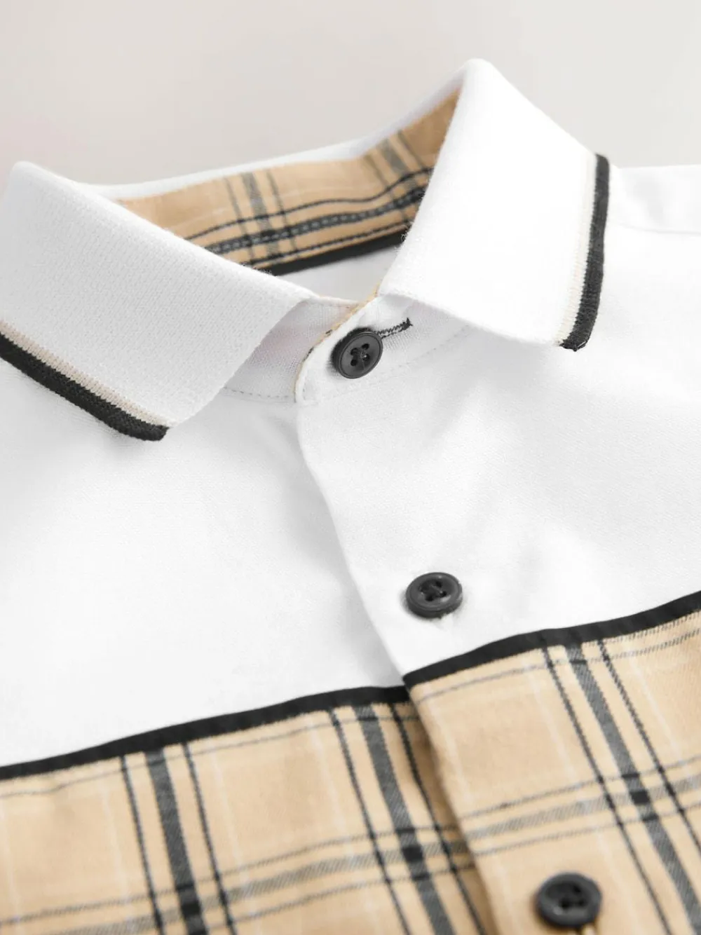 Ready for any smart occasion, this white short-sleeved shirt is a stylish update to his wardrobe. The classic fit and crisp fabric are elevated by a modern check panel across the chest and a contrasting jersey collar. It is a versatile shirt that effortlessly blends smart style with all-day comfort. Jersey collar Check panel Short sleeves Button-up fastening Chest pocket 100% Cotton.
