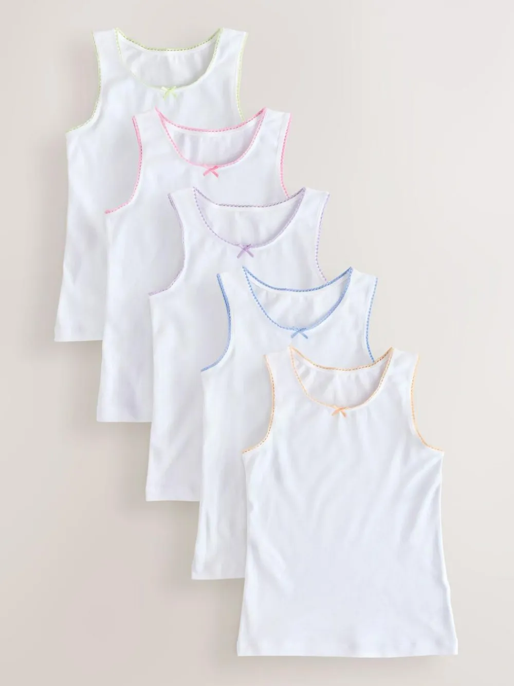 Add an extra layer of comfort to their everyday outfits, with this white 5-pack of cotton-rich vests in a long length, featuring bow detailing and a pop of colour to the trim, wide shoulder straps and a high back shape. 5-pack Cotton-rich fabric Wide shoulder straps High back 5 x Vest 95% Cotton, 5% LYCRA® XTRA LIFE™ elastane. LYCRA® XTRA LIFE™ fibre keeps your underwear looking new for longer, with lasting comfort and fit. This innovative stretch fabric is lightweight and breathable and will hold its shape wear after wear, wash after wash.