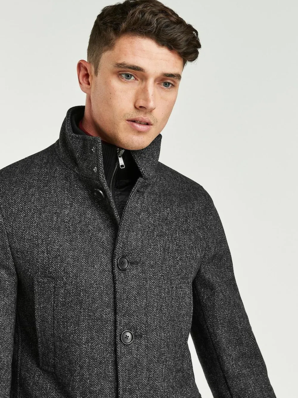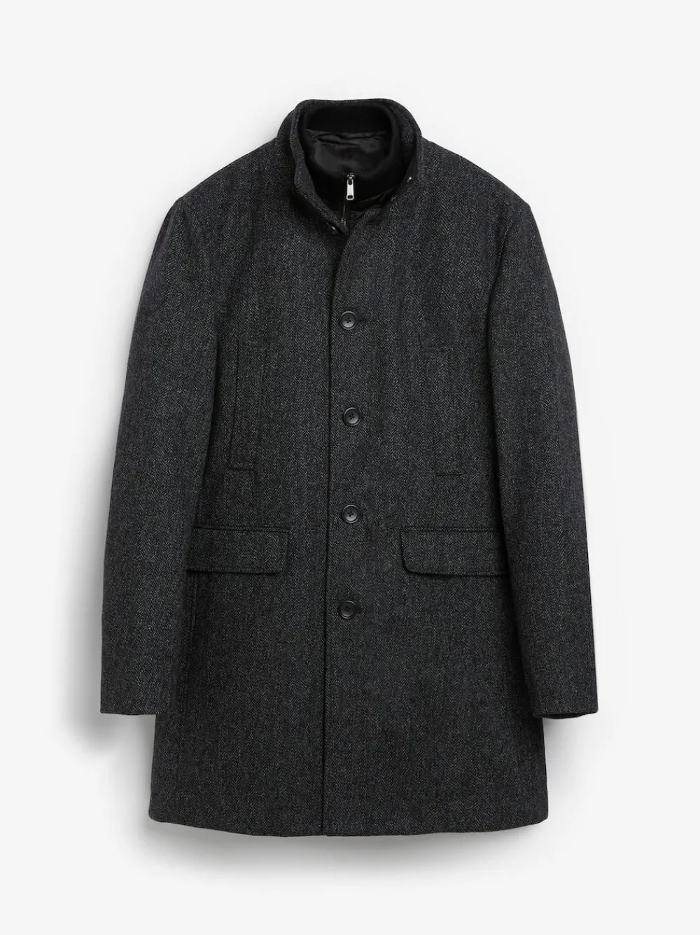 Smart and practical, our charcoal grey funnel neck coat is a clever addition to your outerwear layers. Designed with pockets to keep your hands warm, a cosy funnel neck and ribbed cuffs to help keep out any drafts. A stitched internal gilet provides further warmth on colder days. Smart and practical Funnel neck Stitched internal gilet Versatile style Dry clean only. Main 39% Recycled polyester, 33% Recycled wool, 23% Viscose, 3% Nylon, 2% Acrylic. Backing 100% Polyester. Lining 100% Recycled polyester. Sleeves 100% Recycled polyester.