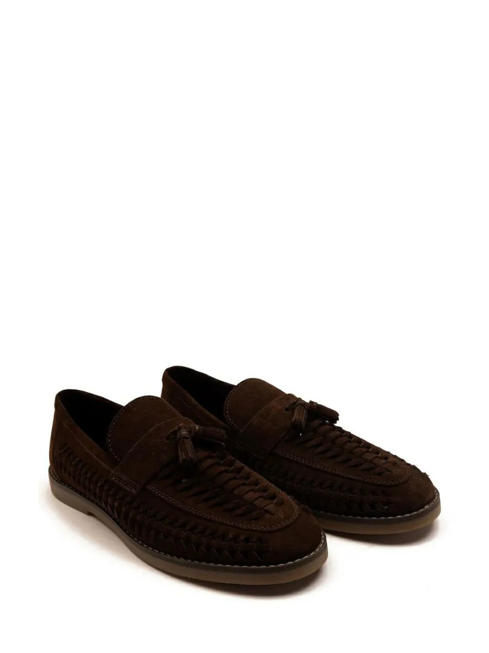 Traditional craftsmanship meets everyday wear in the Tiger loafers. With handwoven-look vamp details and soft brown suede, these tassel slip-ons are perfect for summer weddings, rooftop dinners, or smart-casual days. Slip-on silhouette with front tassels. Rounded toe with raised seams. Low-profile sole for flexibility. Rich brown tone for seasonal wear. Make a quiet statement—Tiger is where texture meets tradition. Main – 100% Leather. Lining – 100% Other fibres. Sock – 100% Other fibres.