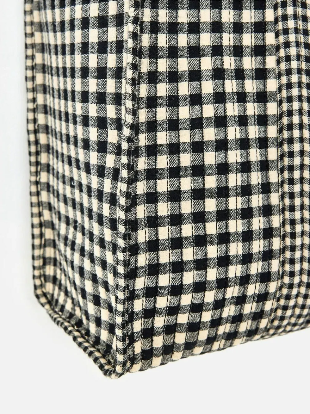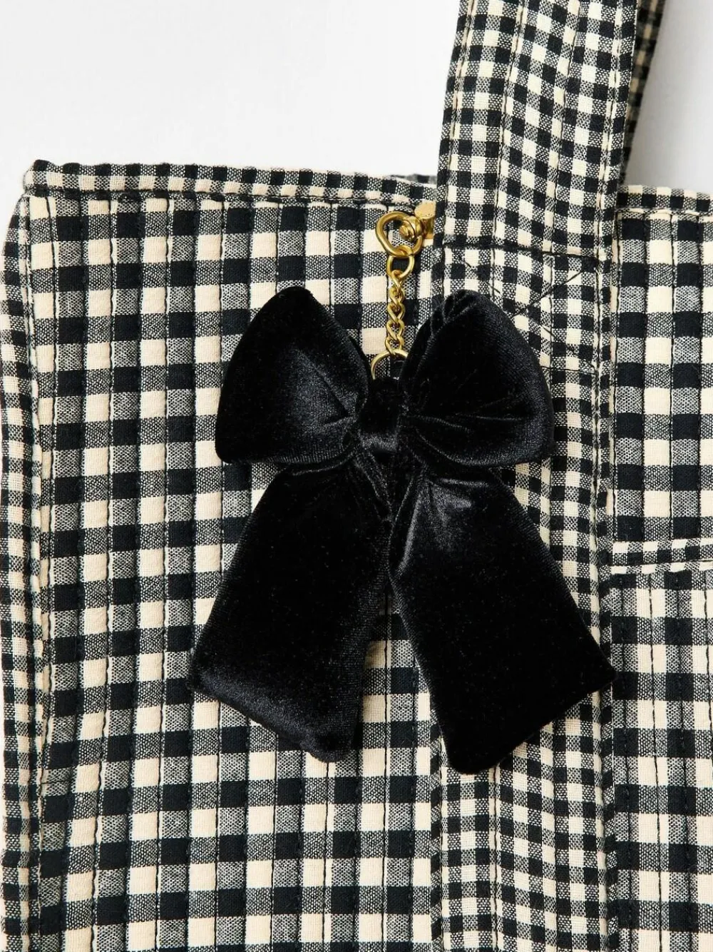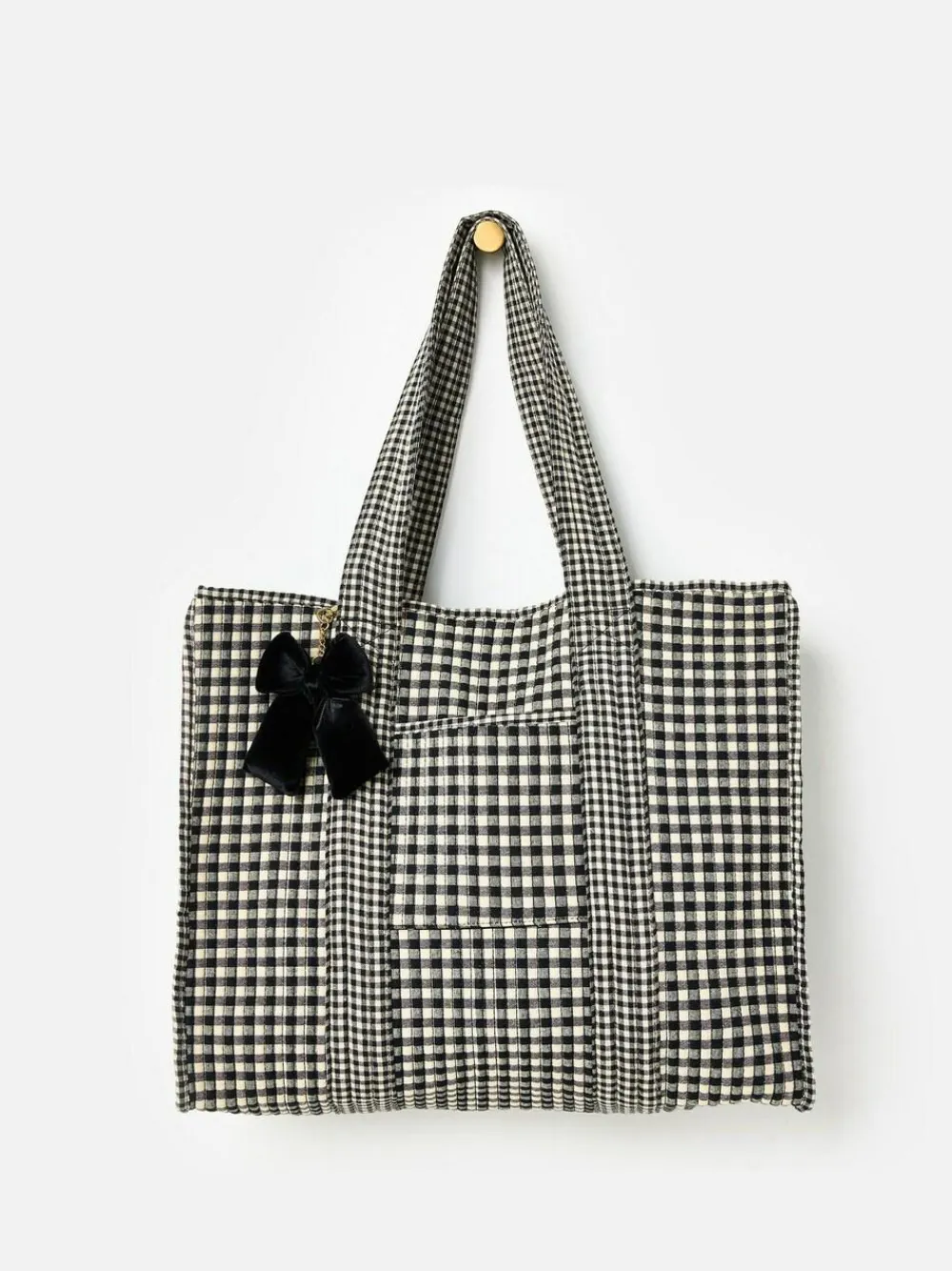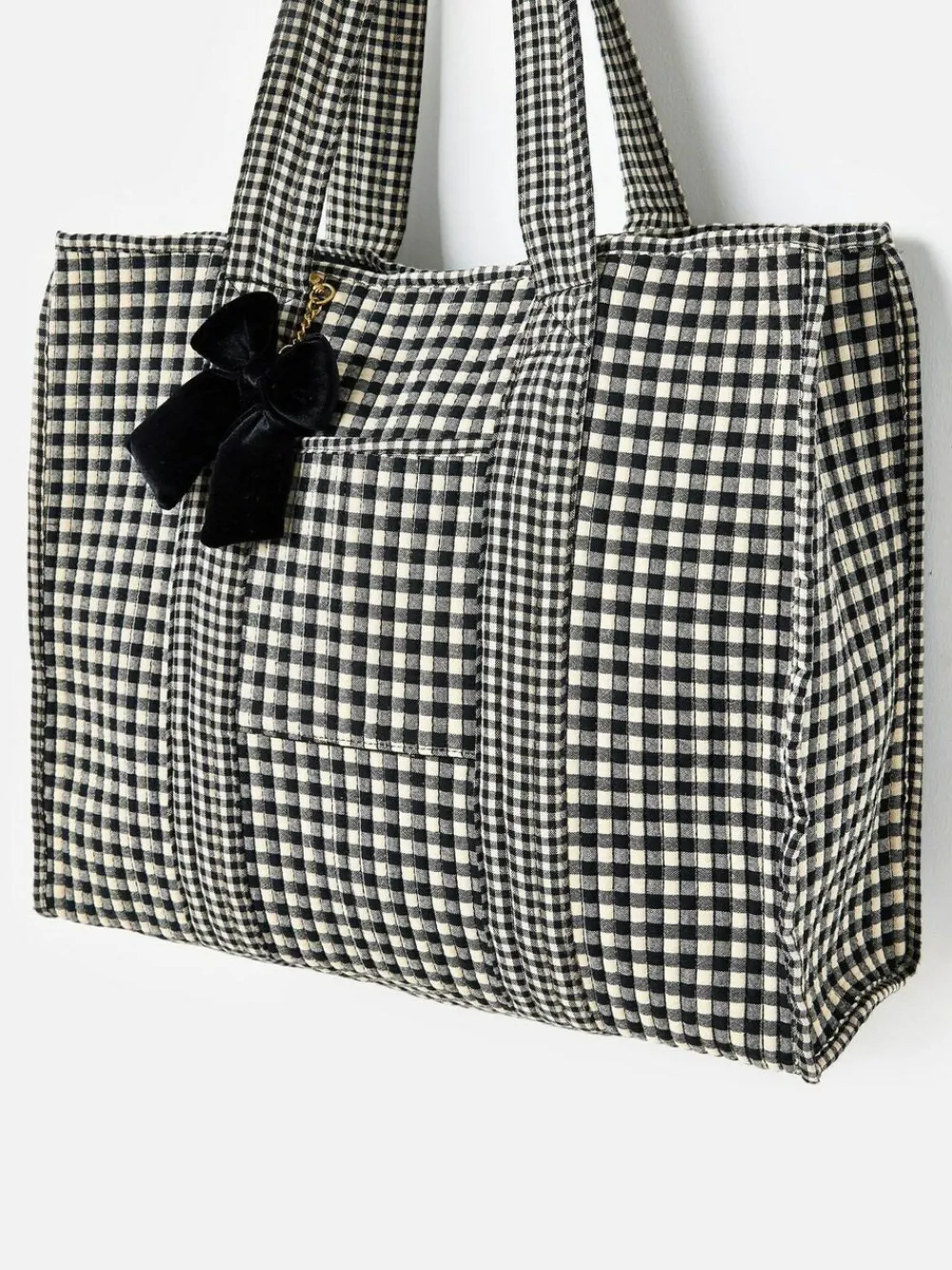 If gingham is your thing, this soft fabric tote bag was made for you. Designed with a black and cream gingham pattern, we’ve added a small pocket on the front for easy access to your essentials and a black velvet bow bag charm because we’re all about those extra details. Featuring an interior pocket with a woven Oliver Bonas patch and matching shoulder handles, we’ve added a magnetic closure to the main compartment. From busy commutes to errand runs, it’s ready for whatever plans your day has in store. Just sling on your shoulder and go. Height 4cm Width 4.5cm Depth 1.5cm Main 100% Cotton. Inner Lining 74% Polyester, 26% Elastomultiester.
