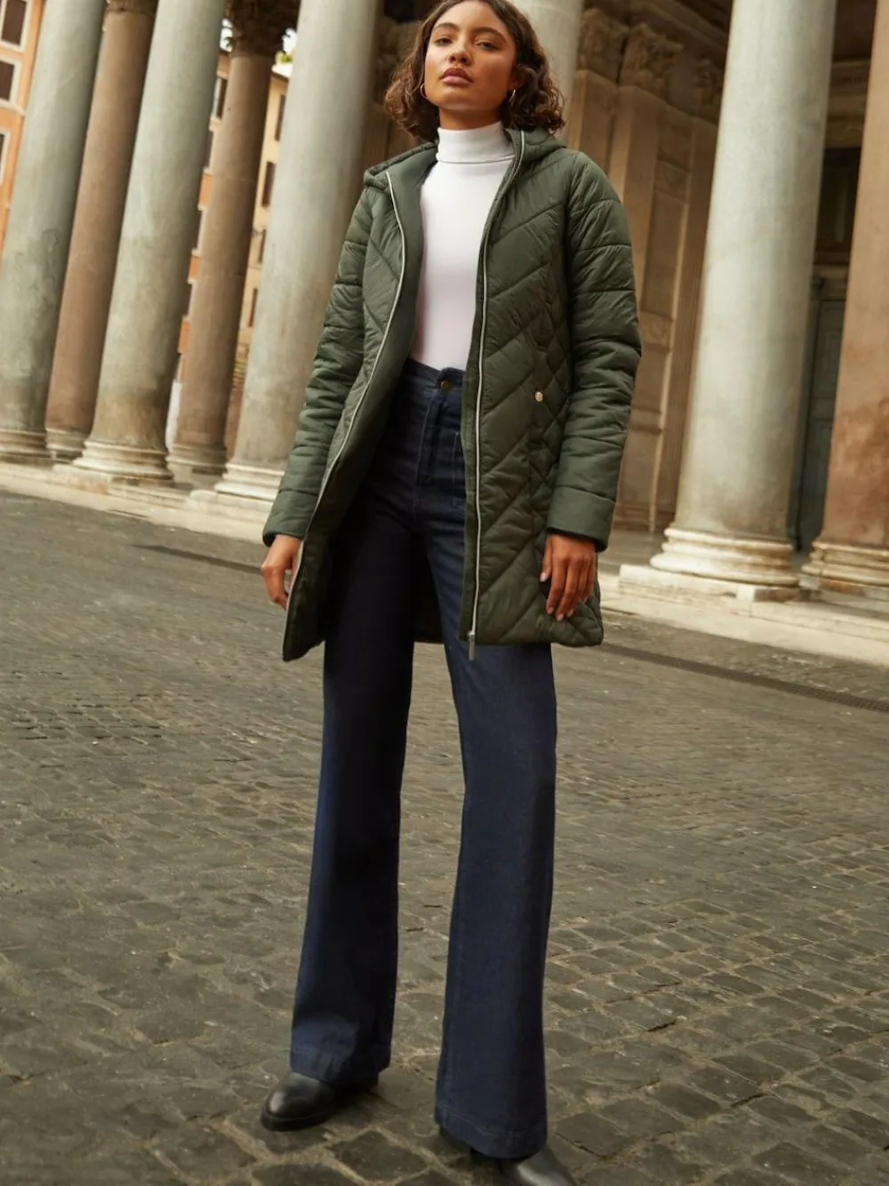 This mid-length quilted jacket is the perfect autumn-winter staple.Featuring: Fitted with a hood Full-length sleeves Functional pockets Zip fastening The model wears size 8 and is 5ft 9”. Wearing Length (Side Neck to Hem) – 88cm. Main 100% Nylon. Lining 100% Polyester. Filling 100% Polyester.