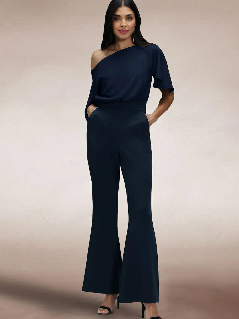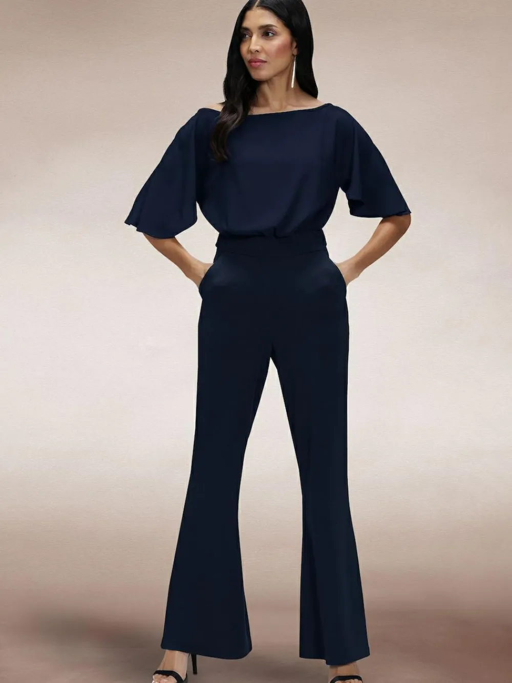 Another timeless jumpsuit from Hot Squash London, perfect for a day at the office or an evening out on the town! This jumpsuit can be worn either as a boatneck style or off-the-shoulder for a more dramatic night-time look. The loose-fitting style top with short sleeves is complemented beautifully with the high-waisted flared trousers in a softly sculpting scuba fabric. The jumpsuit is fastened at the back with an invisible zip for a seamless look. Machine washable. Main 100% Polyester. Lining 95% Polyester, 5% Elastane.