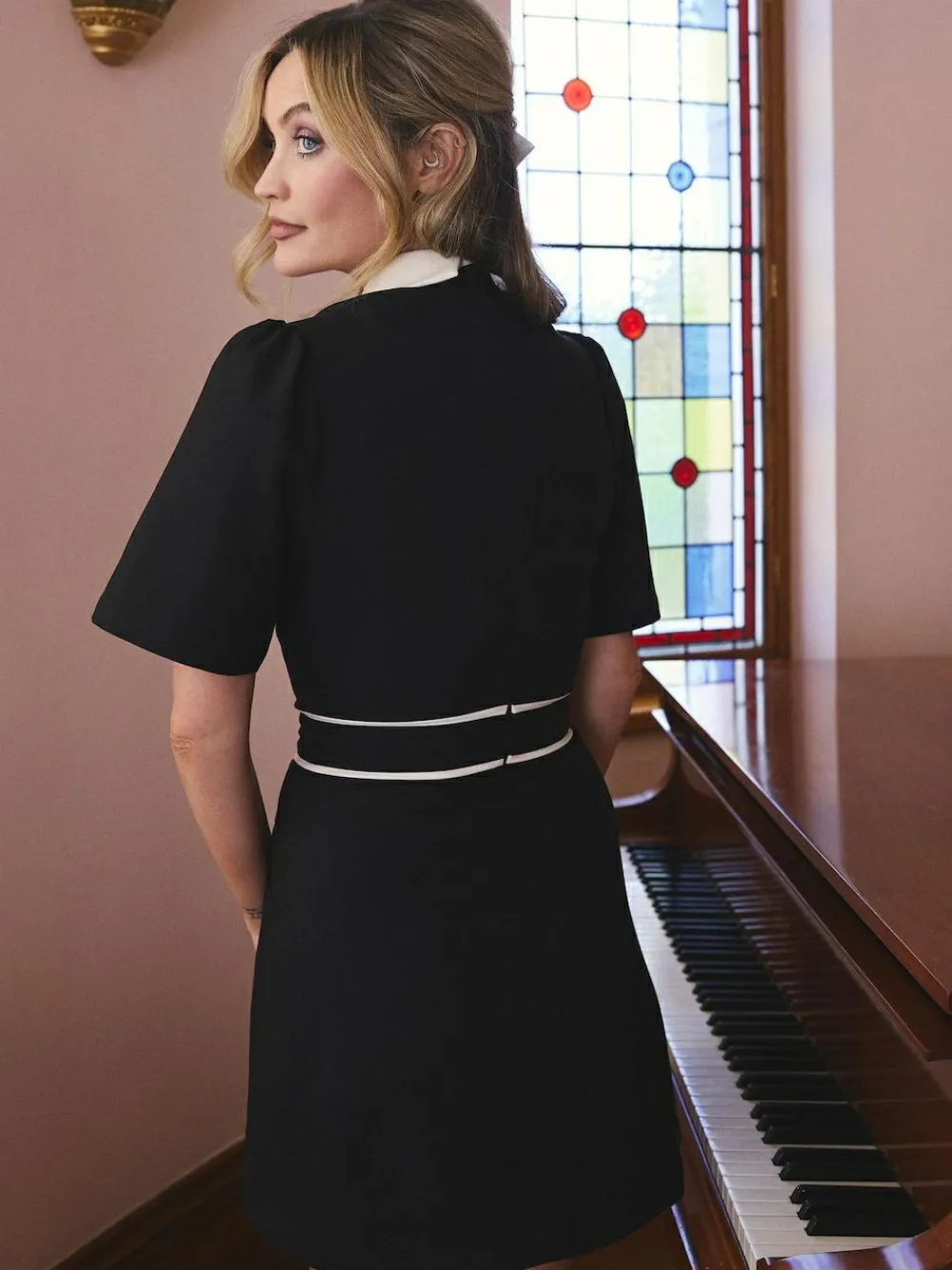Achieve a chic, sophisticated look with this striking black mini dress. It features a sharp contrast collar adorned with elegant pearl embellishment. Subtle contrast piping detailing defines the waist, ensuring a flattering silhouette for special occasions or smart day-to-dinner style. Embellished contrast collar Contrast piping detail Short sleeves Mini length Main 81% Polyester, 17% Viscose, 2% Elastane. Lining 100% Polyester. Flocking 75% Polyester, 16% Nylon, 9% Viscose.