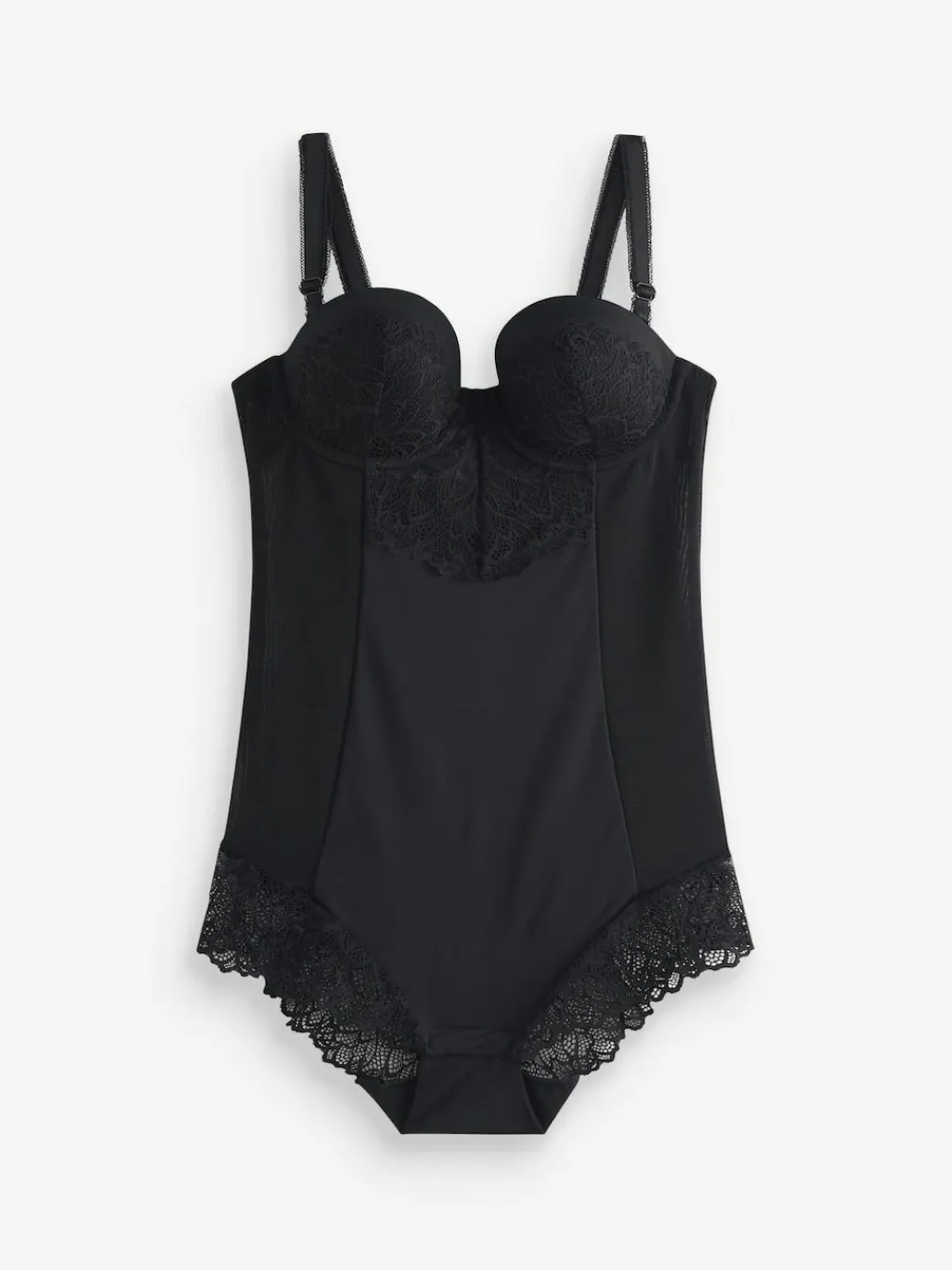 Slip into our firm tummy control cupped lace body for ultimate confidence. Crafted from a blend of nylon and elastane with a touch of cotton for that extra softness, it discreetly shapes and smooths your silhouette for your favourite body-hugging outfits. Featuring multi-way straps, this lace body can be worn regularly, strapless, halterneck, or cross-back, so it’s always ready to adapt to your outfit. The elegant lace detailing adds a delicate feminine touch for that extra elegance. Lace body Multi-way straps Tummy control Machine washable. Main 78% Nylon, 18% Elastane, 4% Polyester. Gusset 100% Cotton.