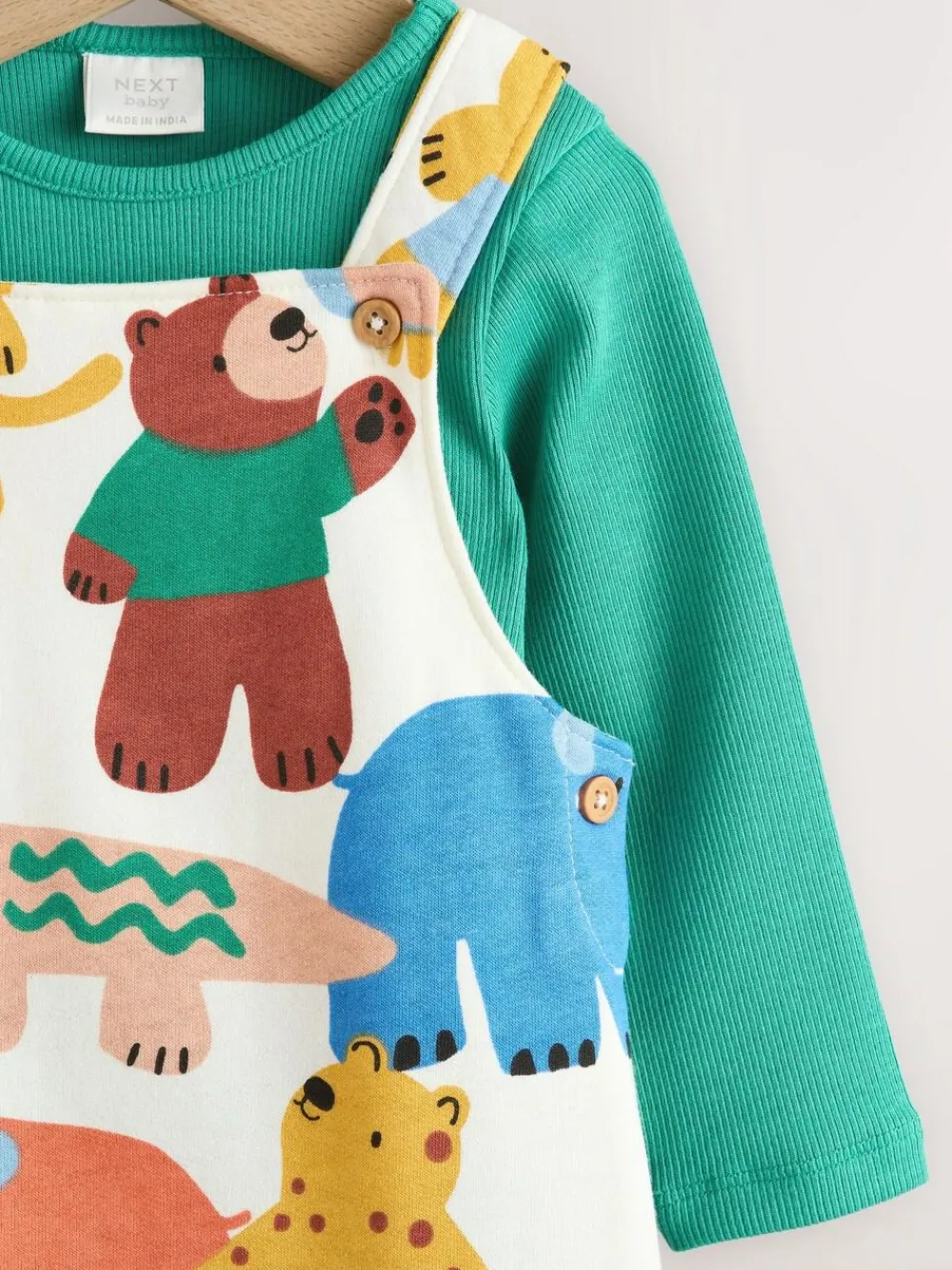 This 2-piece set is comfortable and cute, featuring a soft cotton-blend bodysuit with long sleeves and a popper fastening for easy changing, alongside a pair of pure-cotton dungarees with shoulder straps, available in a selection of different colours and prints. 2-piece set Long sleeve bodysuit Cotton-blend Popper fastening to the crotch 100% cotton dungarees Shoulder straps Machine washable. Dungaree 100% Cotton. Bodysuit 95% Cotton, 5% Elastane. Warning: Keep away from fire and flames.