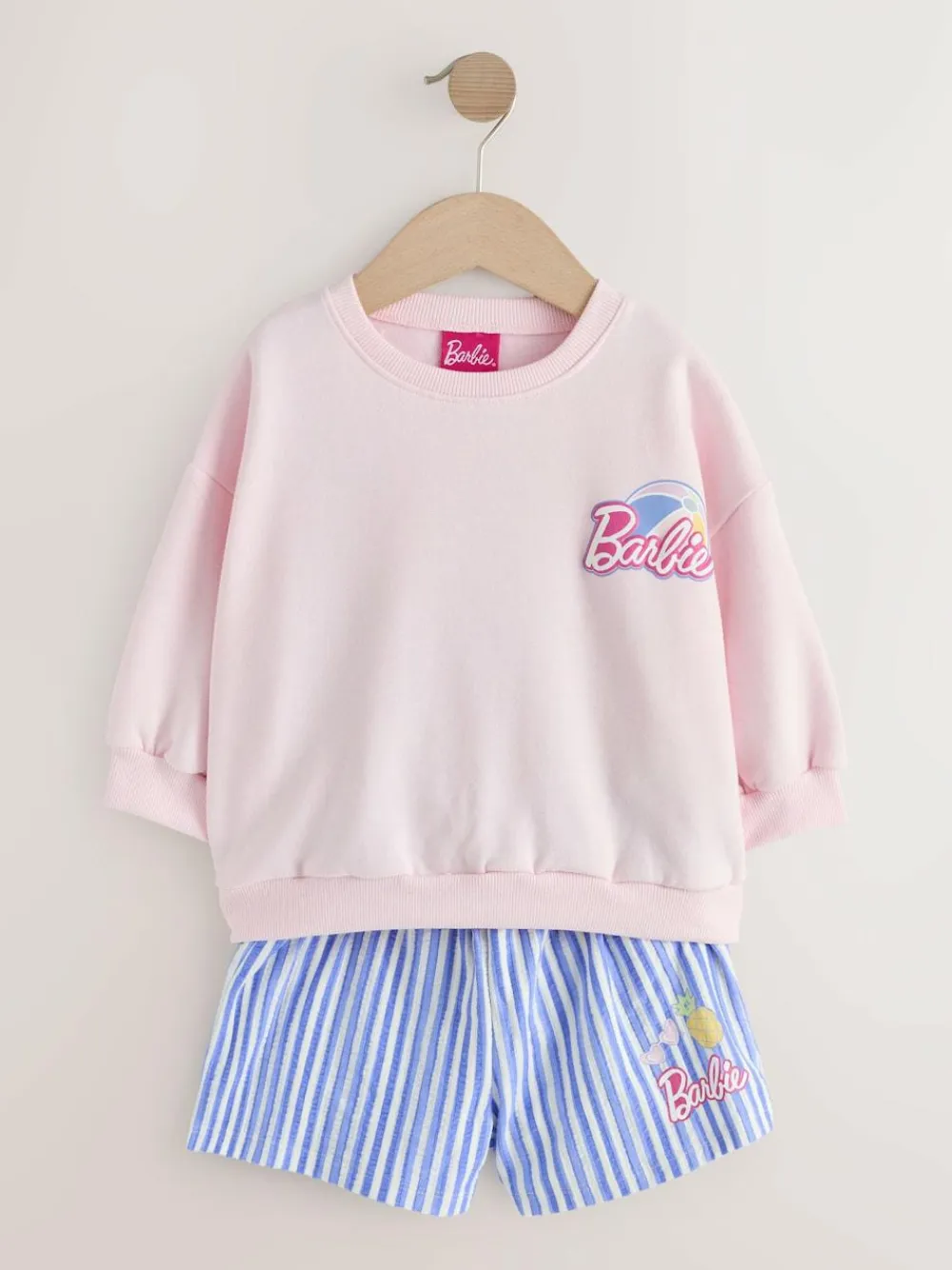 This fun Pink Barbie Shorts Set is a cute casual outfit for her wardrobe. The set features a brush back sweat top with a large Barbie graphic print on the back. The coordinating striped shorts have charming love heart pockets detail and a small Barbie logo embroidery. Barbie graphic and logo Love heart pockets Brush back sweat top Striped shorts Sweater 85% Cotton, 15% Recycled polyester. Shorts 100% Cotton.
