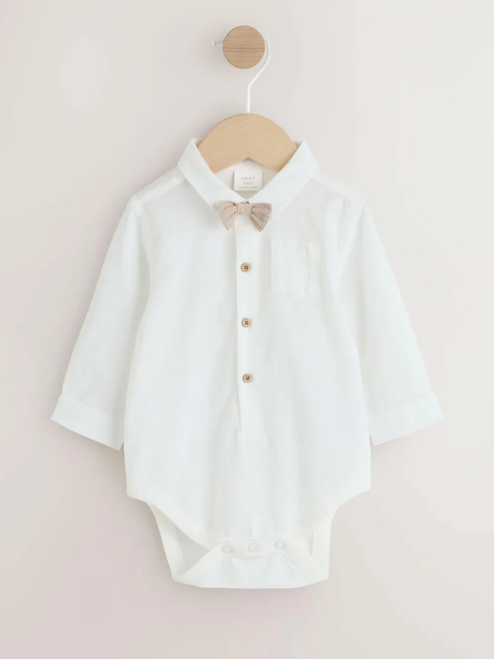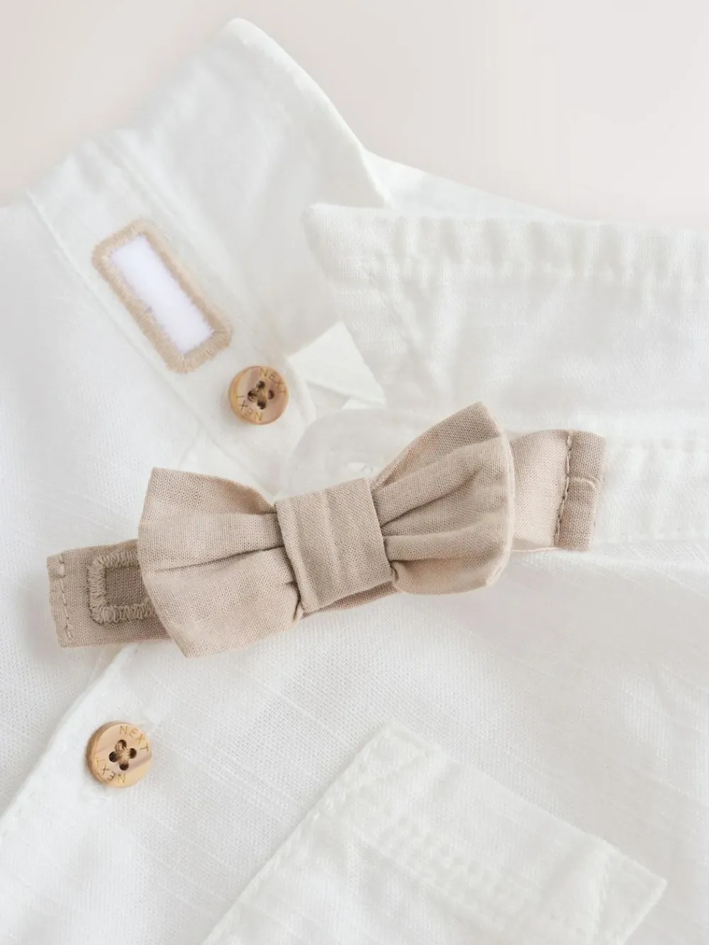 Dress your little one in this adorable sage green 3 piece set, perfect for any smart occasion. The set includes crisp trousers with attached braces and a long-sleeved shirt, complete with an attached mock bow tie for an effortless formal look. The soft fabric and easy fastenings ensure comfort and practicality. Mock bow tie attached to collar Braces attached to trousers Long-sleeved shirt 3 piece set Button fastening Popper opening on shirt bodysuit Machine washable. Shirt and Shorts 100% Cotton. Braces 88% Polyester, 12% Elastane. Warning: Keep away from fire and flames.