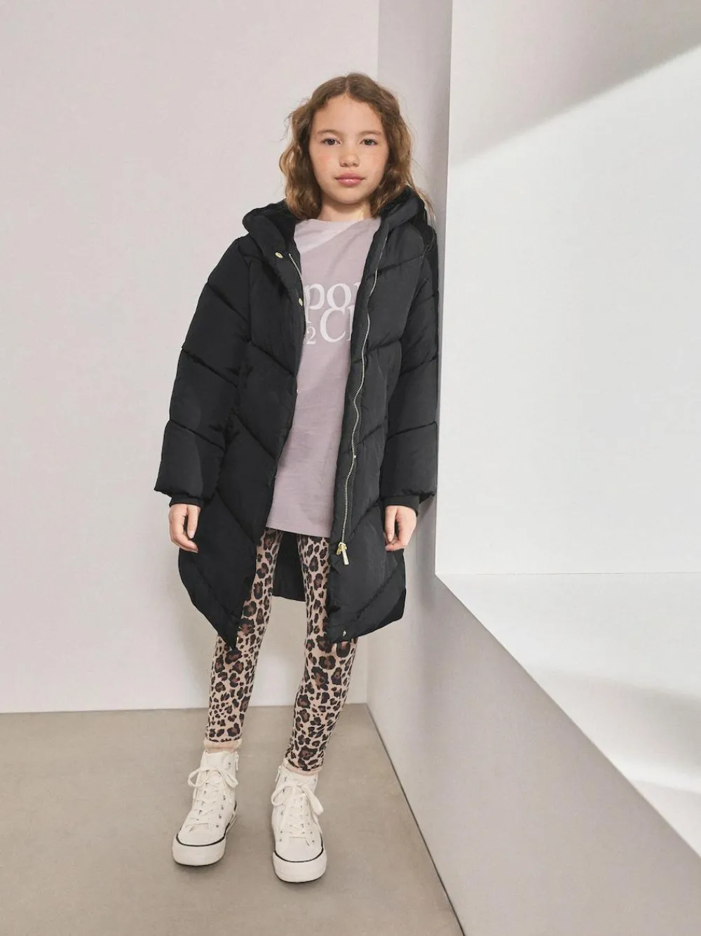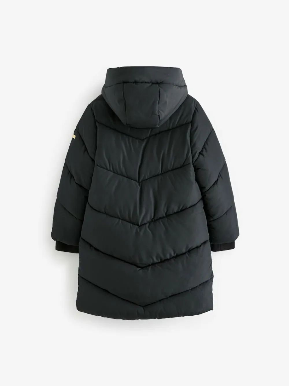 Our padded, shower resistant black coat in regular length has a chevron duvet design that’ll keep them warm in the colder months ahead. A faux fur lining and fleece lined pockets add to the cosiness of the coat, finished with a zip-through fastening and hood. Winter padded coat Shower resistant Fleece lined pockets Faux fur lined Hooded Padded Machine washable. Main 100% Recycled polyester. Lining 100% Recycled polyester. Filling 100% Recycled polyester. Sleeve Lining 100% Recycled polyester.