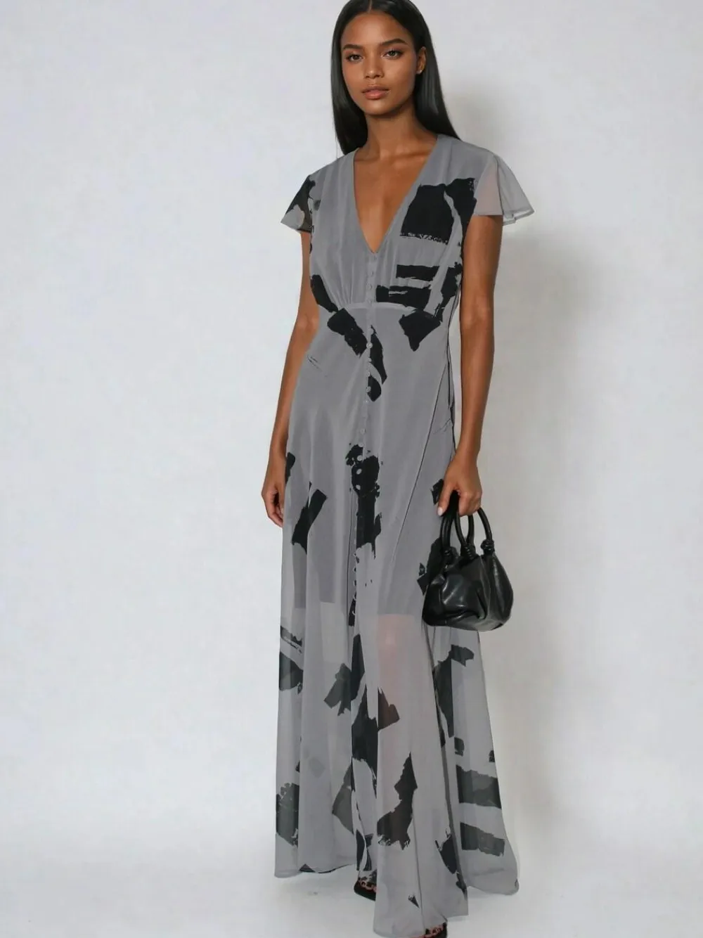 The Indium maxi dress is a stunning blend of elegance and sophistication, in our abstract Facade print in soft grey with black. This flattering, bias-cut dress features a deep V-neckline and short, floaty sleeves, offering a timeless and graceful silhouette. The maxi length and centre front slit add a touch of allure, while the fine faux button detailing enhances its classic charm. Perfect for any special occasion, the Indium maxi dress exudes effortless style and refinement, ensuring you look and feel your best wherever you go. The model wears a size UK 10. Length from the top: 145 cm. Regular side neck to hem 57″ / 145cm. Machine washable. Shell 100% Polyester. Lining 100% Viscose.
