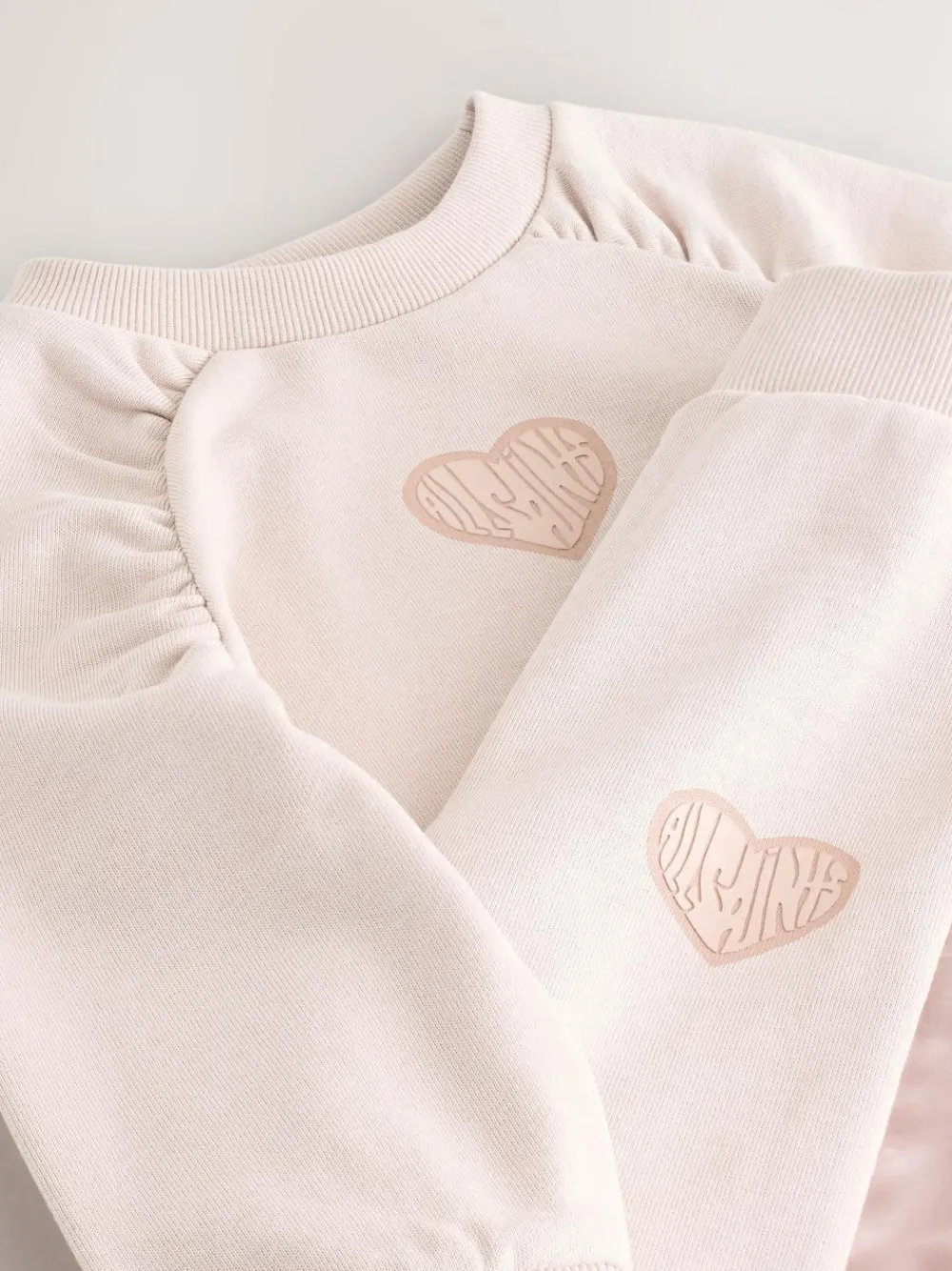 Elevate their wardrobe with the smALLSAINTS Light Pink Lover Sweatshirt and Wide Leg Joggers Set. This ensemble features the Talon oversized sweatshirt paired with matching wide leg joggers, both crafted for all-day comfort. The set is features the AllSaints ‘Lover’ logo on both the chest and leg, applied using a tactile highbuild technique. Unique design elements elevate this classic silhouette, including raglan sleeves with ruched detailing on the top and a luxurious satin panel along the side of the trousers. Built for practicality as well as style, the joggers are finished with a functional side pocket and an elasticated waist to ensure a secure and flexible fit. 2 piece set AllSaints ‘Lover’ logo Ruched detailing Satin panel to joggers Machine washable. Sweater and Jogger 100% Cotton.