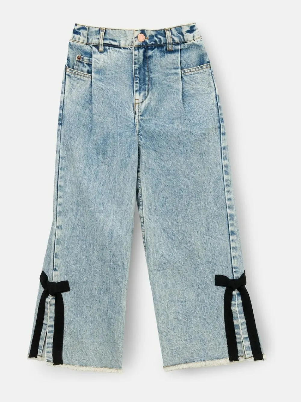 These light wash jeans are the cut of the season! With a wide leg cut featuring a frayed edge and playful bow details on the legs and rear pockets, they’re the perfect blend of casual and cute. Wear with anything for a laid-back, stylish look. Machine washable. 100% Cotton.