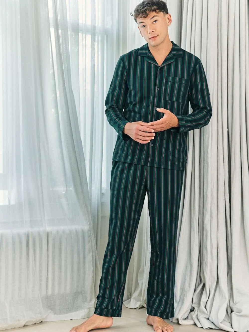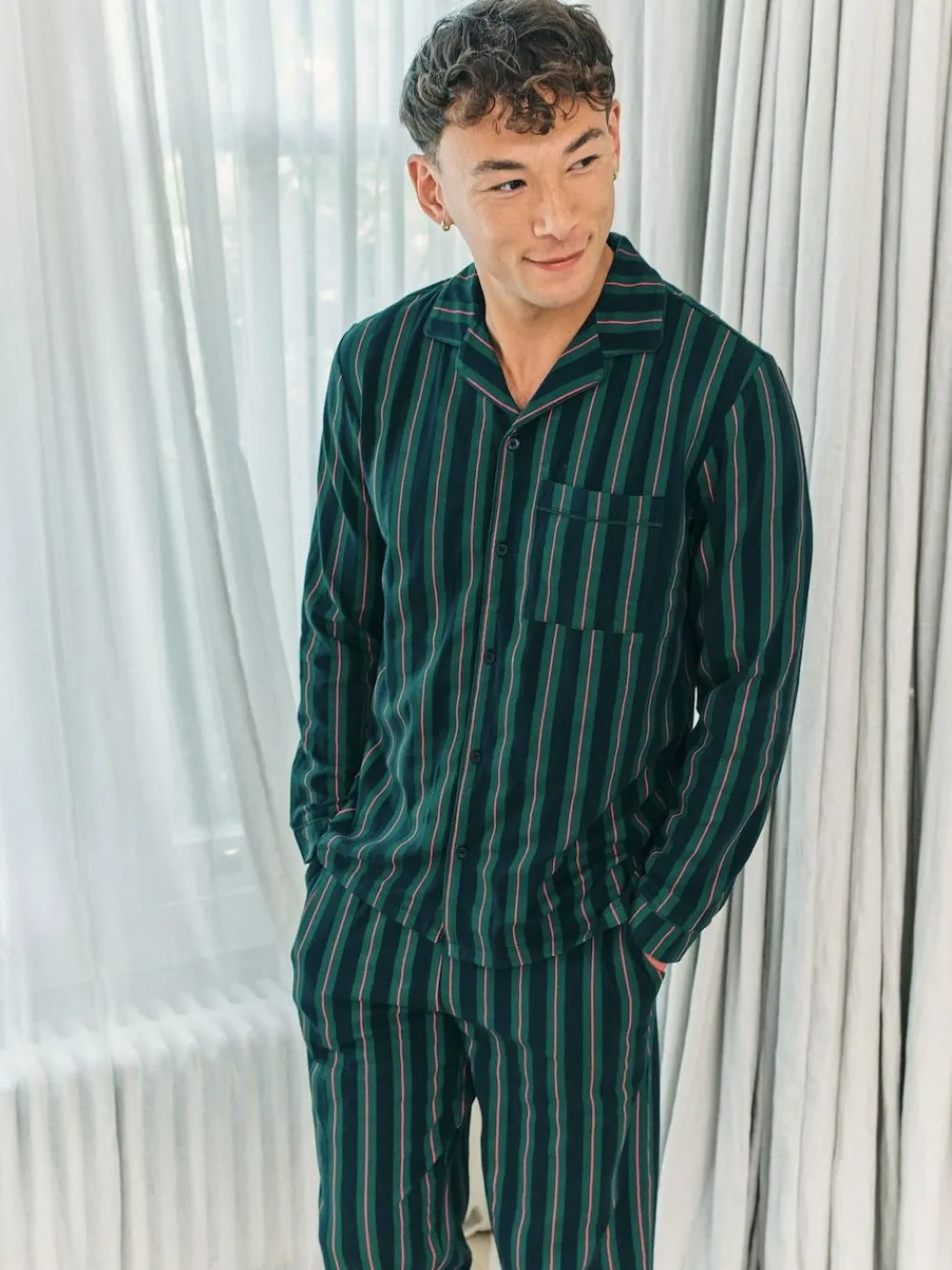 Classic, but not too serious, this revere collar pyjamas set is cut from cotton and finished in a navy and green vertical stripe with a subtle red thread running through. The shirt features a button-up front, chest pocket and tonal piping for a polished touch, while the matching trousers come with an elasticated waistband and side pockets for laid-back comfort. Sharp style for a Saturday night in, soft enough for Sunday morning. Machine washable. 95% Cotton, 5% Elastane.