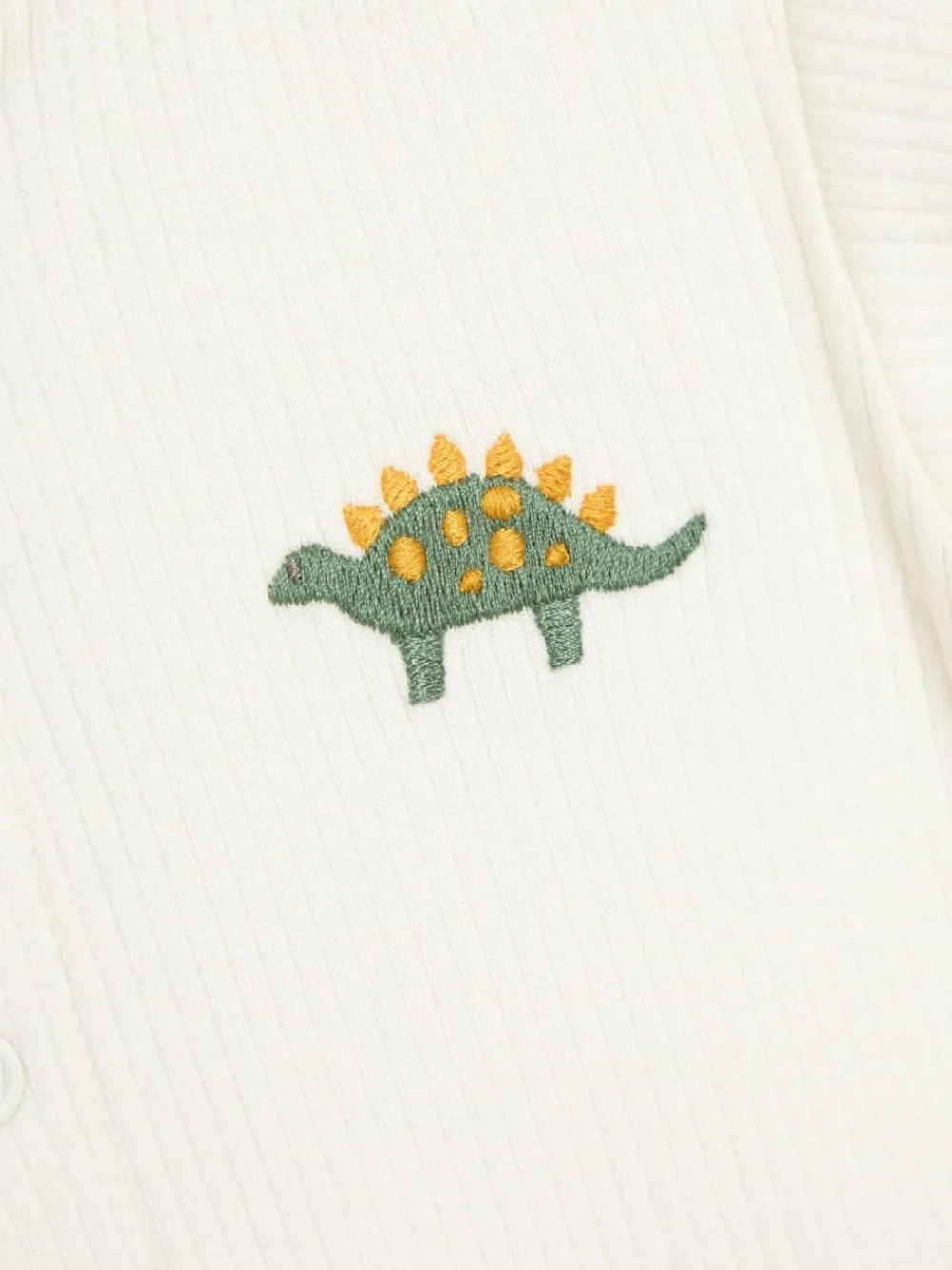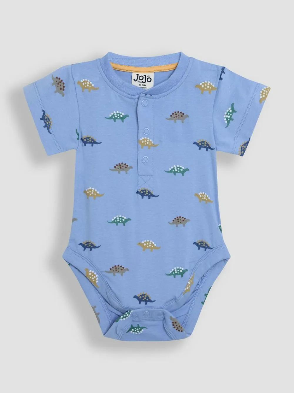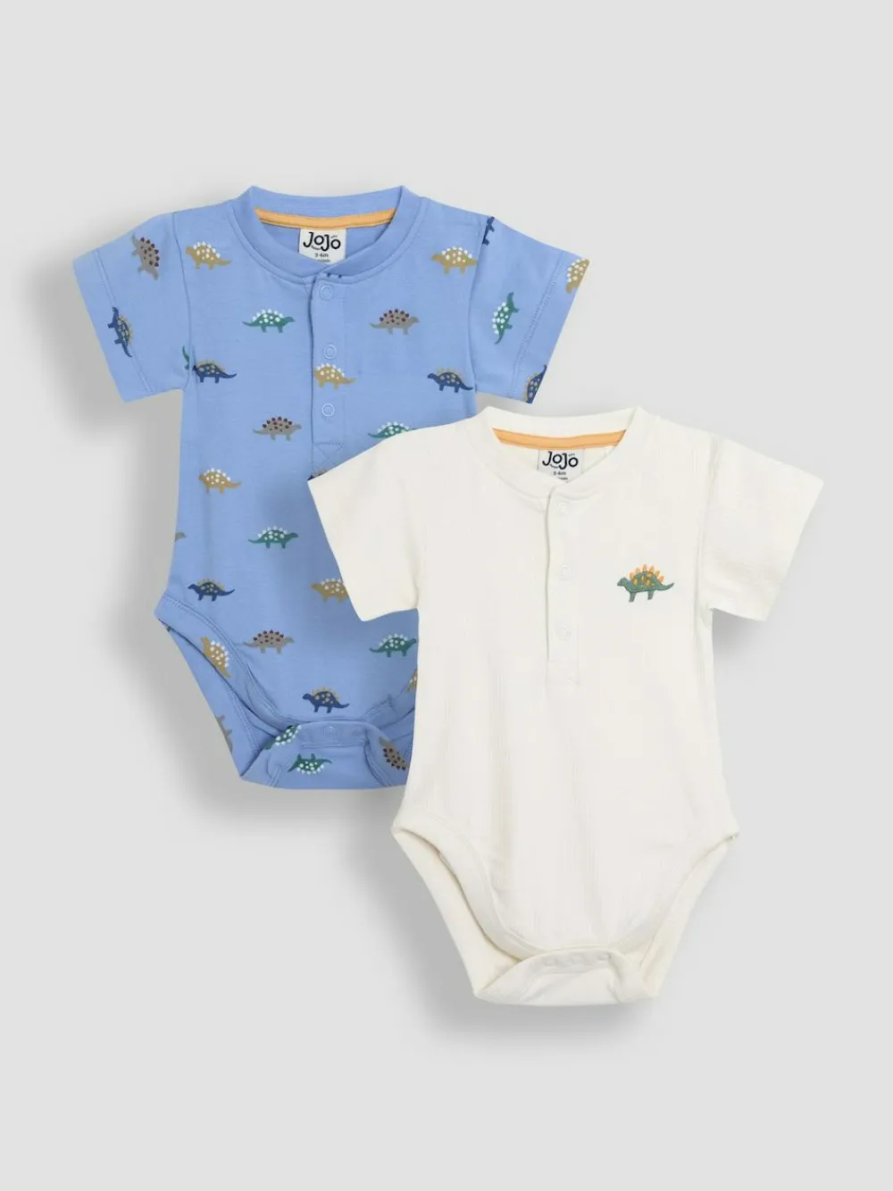 Enjoy summer fun with this pack of two stegosaurus print bodysuits, perfect for your little one! Made to be gentle on baby’s delicate skin, they’ll love the easy-breezy all-day comfort of these summer staples. The charming tractor print adds a touch of adventure to your baby’s wardrobe. Ideal for layering or wearing on their own on balmy summer nights. 2-Pack bodysuits, one blue with dino print, one cream with dino motif Round neckline Half-down poppers on front Poppers at crotch for easy changing Short sleeves Machine washable 95% Cotton, 5% Elastane. Warning: Keep away from fire and flames.