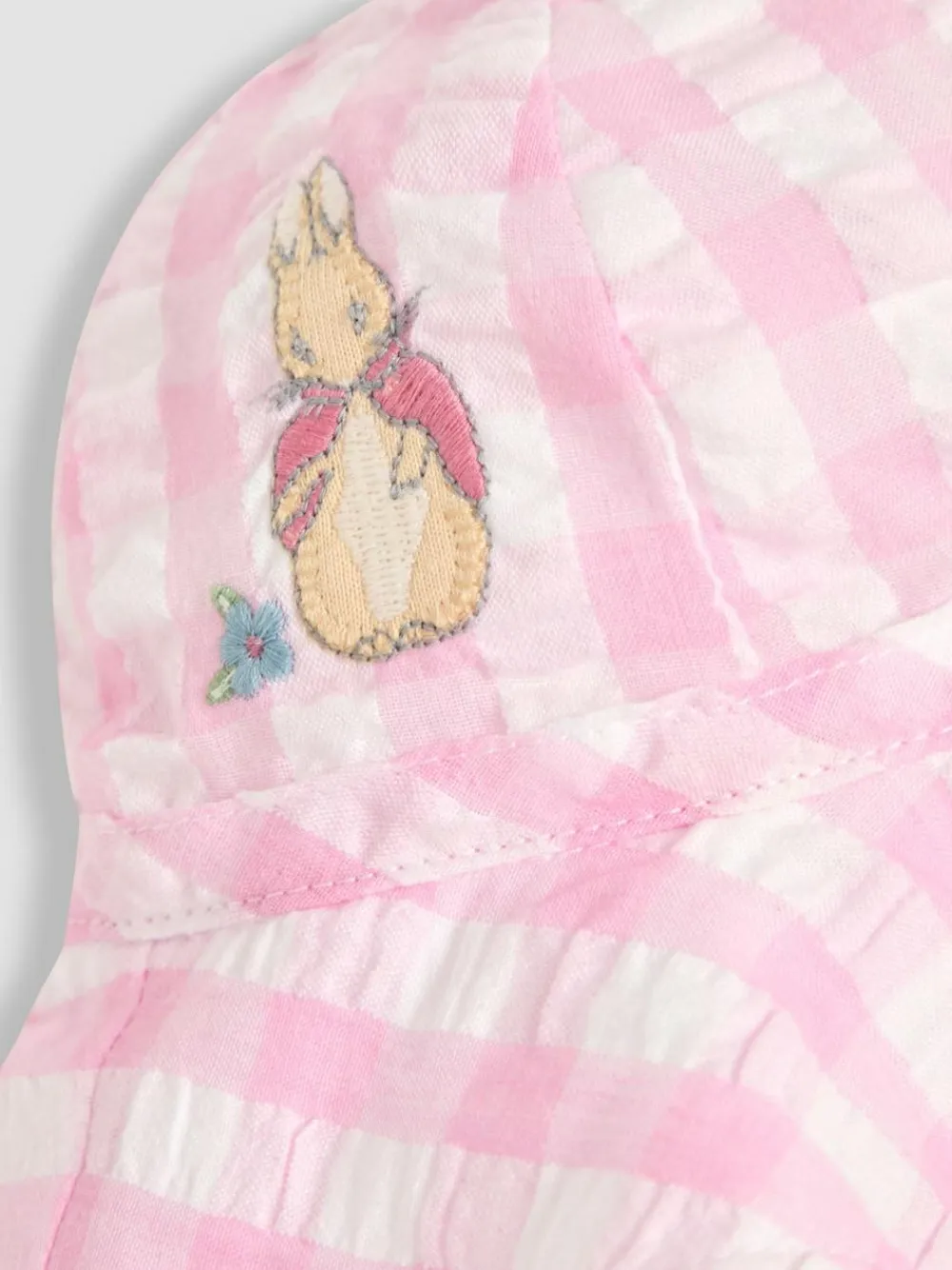 Get your little one ready for sunshine in this adorable Gingham Flopsy Bunny Sun Hat. Made with comfy, breathable cotton that is delicate on the skin, with the sweet addition of the little Flopsy Bunny motif, little ones will stay feeling cool and looking oh so cute. The wide brim will keep the sun out of their eyes and off of their face while the practical chin ties ensure this hat will stay on as they play. Pink gingham sun hat Flopsy Bunny motif Chin ties Wide brim WARNING: Sun exposure causes skin damage. This item will only provide protection to areas directly covered and, to a lesser extent, areas shaded from the sun Only covered areas are protected, other exposed areas of the body should be protected by a high-factor sun cream Protection offered by this item may be reduced with use, or if stretched or wet Young children are particularly at risk of sunburn because of their delicate skin, babies are especially vulnerable Keep babies out of the sun. Hats cover heads and the nape of necks plus help protect eyes from glare 100% Cotton.