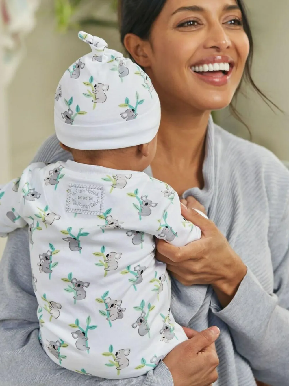 Printed with a sweet koala motif on fresh white cotton and finished with a traditional knotted top, this baby hat is an adorable way to keep new babies’ heads warm. Paired with the coordinating Koala Print Zip Baby Sleepsuit, the hat makes a beautiful gift or to create a sweet coming home outfit. All-over koala print Supersoft touch Fully lined in soft cotton Knotted top Turn back the brim Coordinates with the Koala Print Zip Baby Sleepsuit 100% Cotton Machine washable Machine washable. Main 100% Cotton. Lining 100% Cotton.